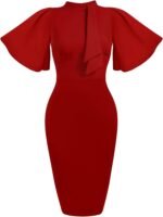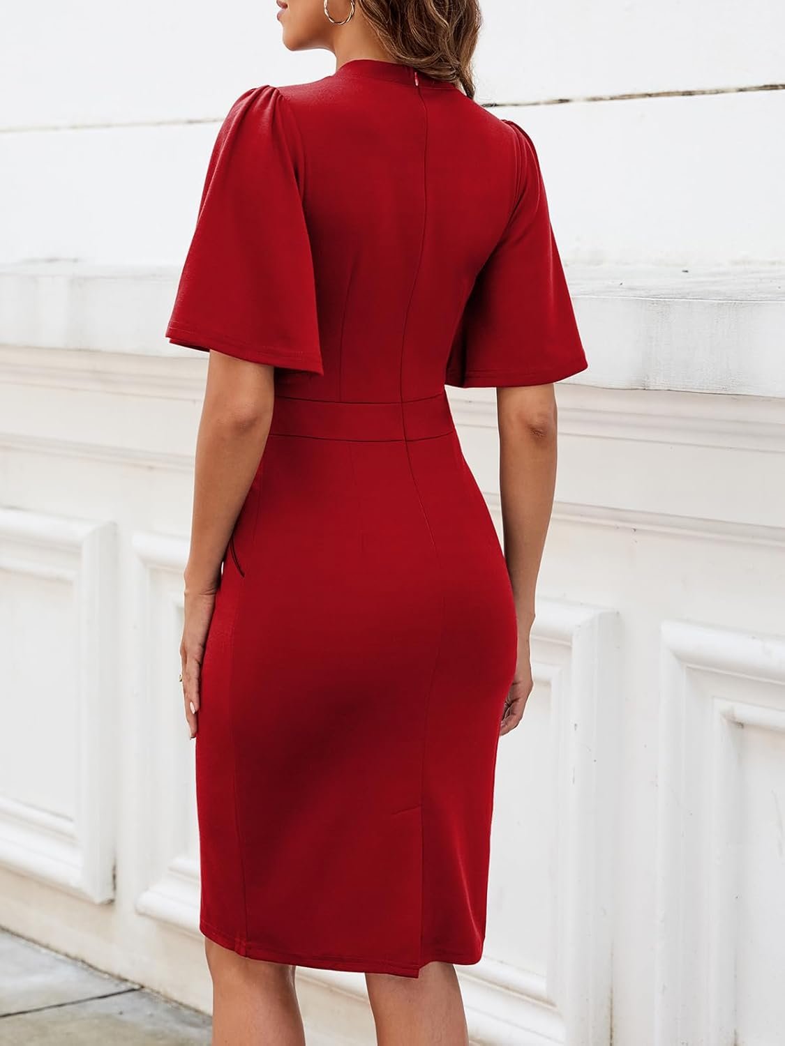 Womens elegant cocktail dresses with ruffle short sleeve,v neck,ruffle sleeve,bodycon,midi length,pencil dress.Flutter sleeve design cover the line of body to look slimmer.
