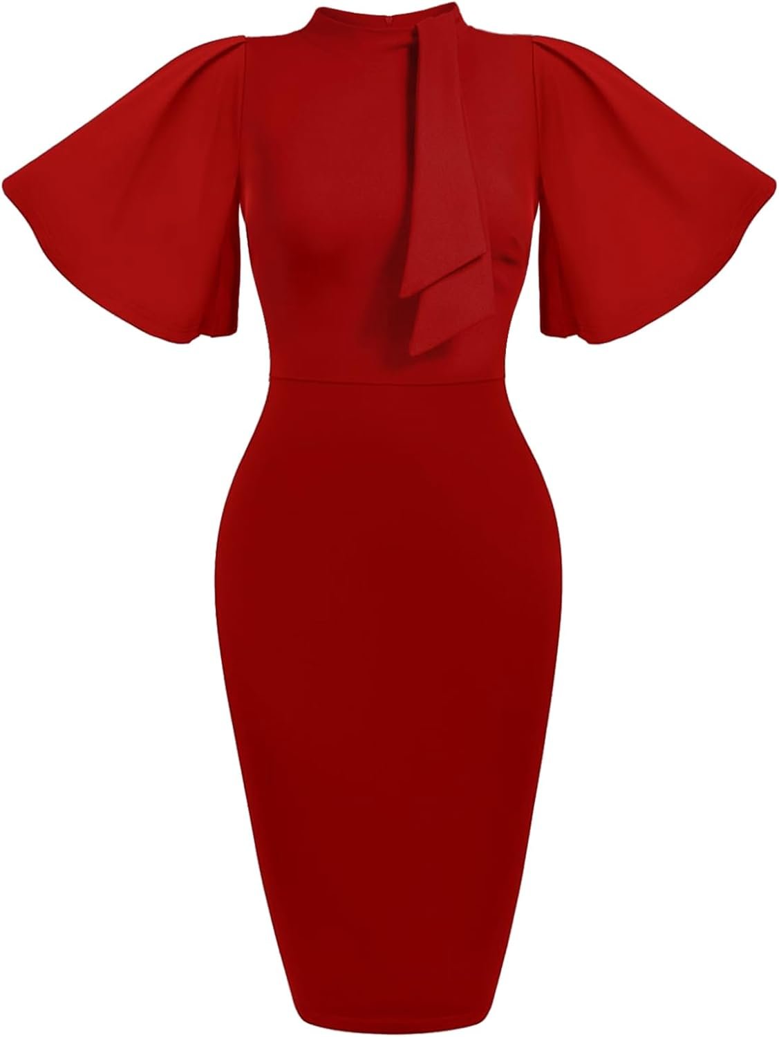 Women’s 2024 Flutter Sleeve Bodycon Midi Dress Sexy Crew Neck Wear to Work Cocktail Party Pencil Dresses