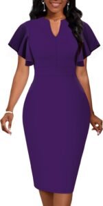 Womens Short Ruffle Sleeve Church Dress 50S Vintage V-Neck Bodycon Work Pencil Midi Dress