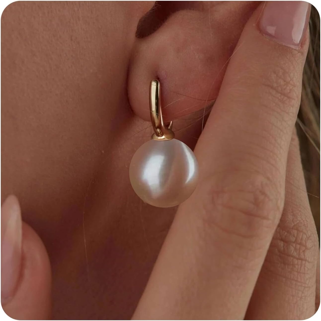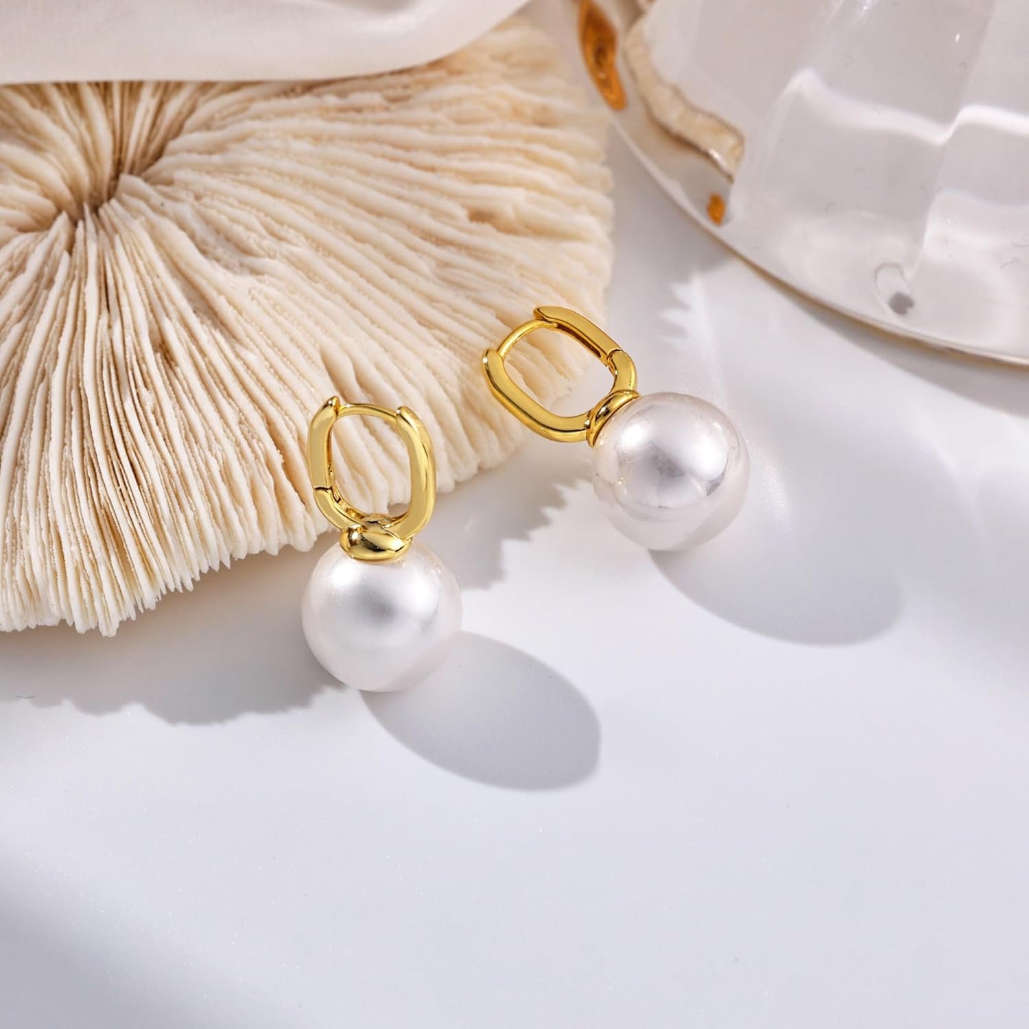 Moodear Pearl Earrings for Women Trendy 14K Gold Plated/925 Sterling Silver Pearl Drop Hoop Earrings Elegant Hypoallergenic Gold Pearl Dangle Earrings Wedding Jewelry Gifts for Women