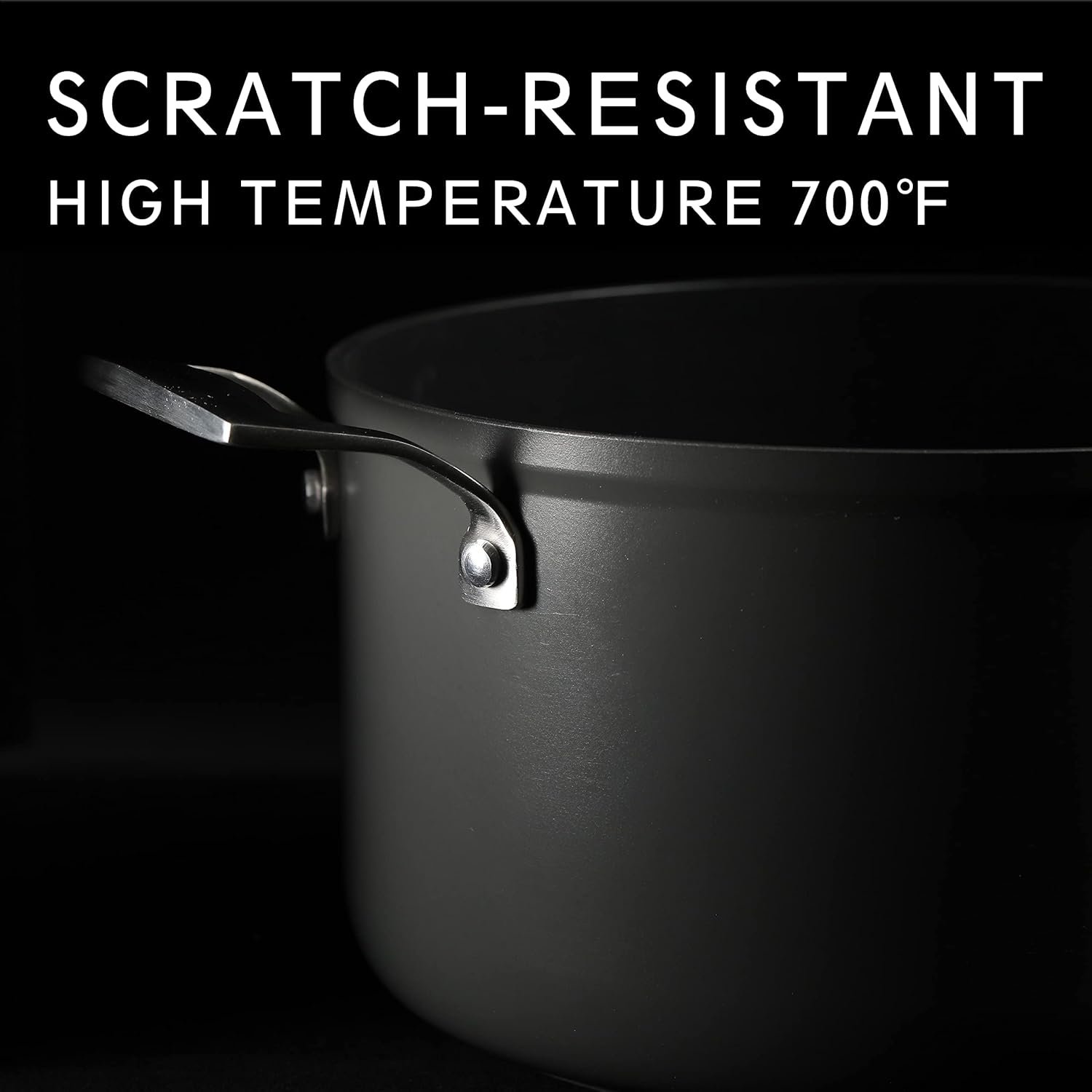 Scratch-resistant: the pot body is resistant to scratches even from hardwood spatula at 700℉. Lid constructed of shatterproof tempered glass.