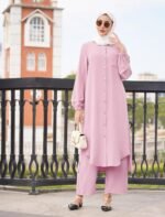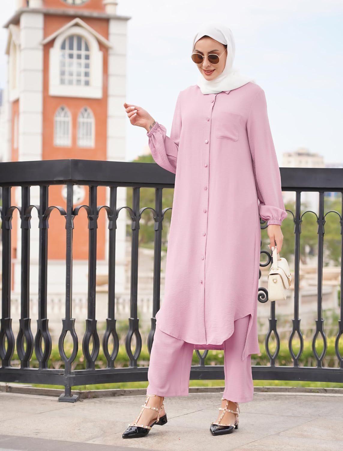 Women Muslim 2 Pieces Sets Long Sleeve Button Down Shirt and Pants Abaya Dress