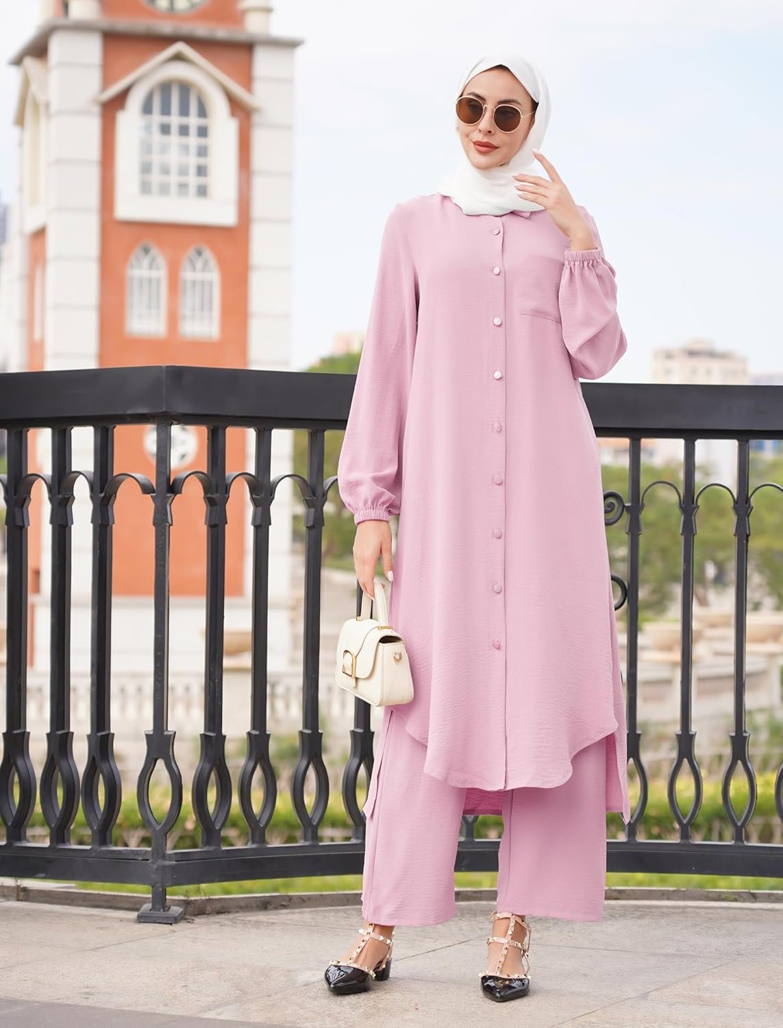 Muslim Clothes for Women 2 Piece Set Long Sleeve Button Down Shirt and Pants Ramadan Abaya Dress Islamic Dubai Outfits