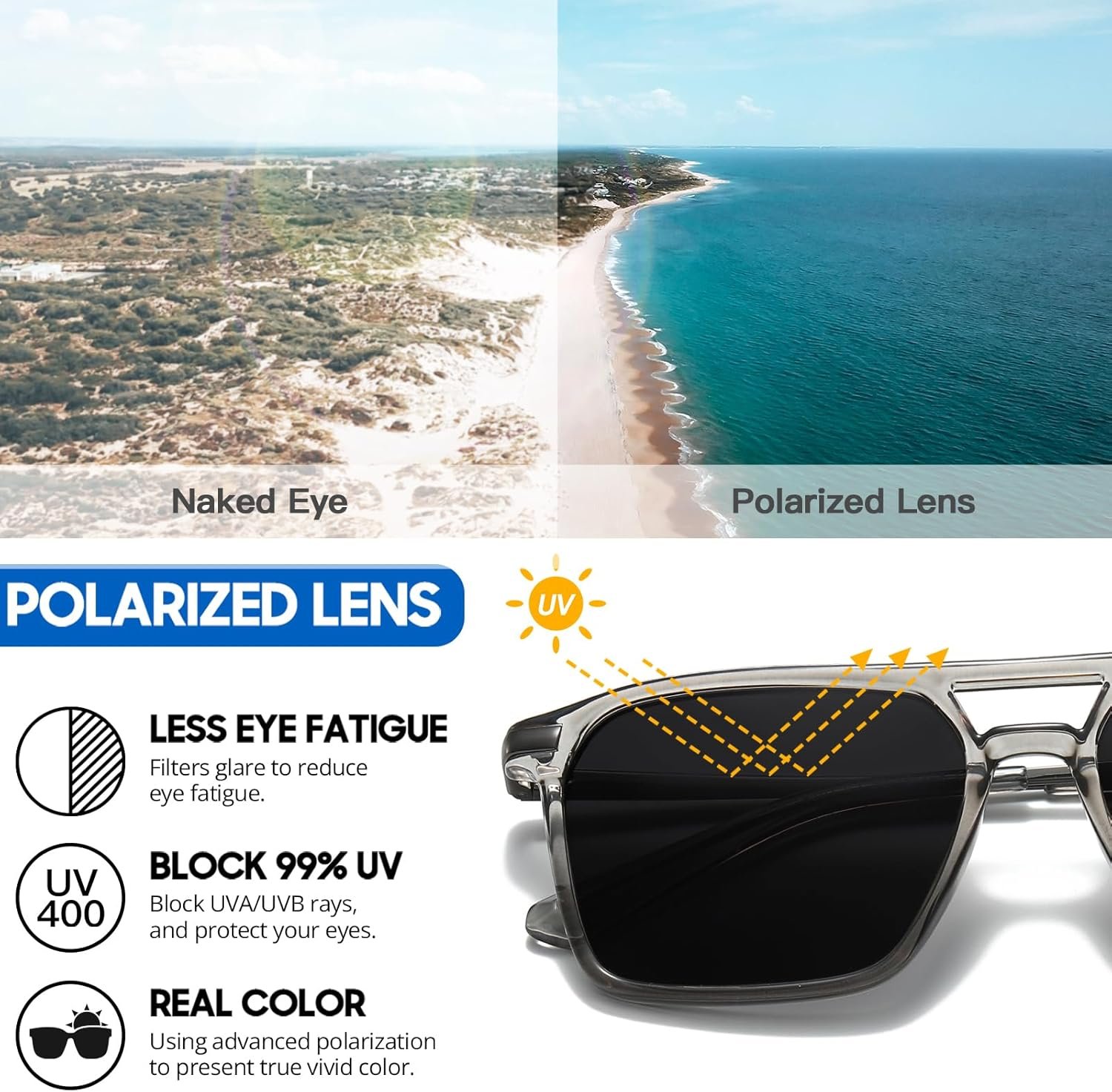 Our sunglasses not only have polarization, but also UV400 protection, which can block 99.99% of harmful UVA and UVB light, keep your eyes safe.