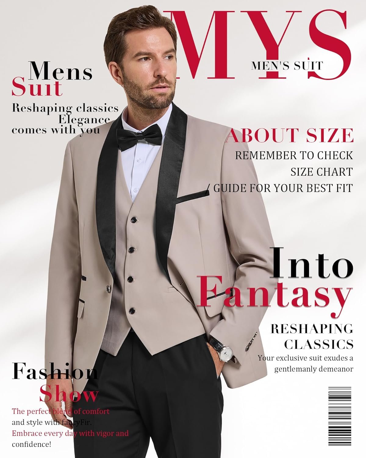 MY’S Mens 3-Piece Suit Shawl Lapel One Button Tuxedo Winter Fabric Slim Fit Dinner Jacket Vest Pants & Tie Set