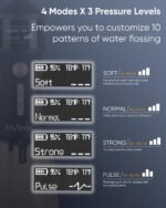 CUSTOMIZABLE PRESSURES & READABLE DISPLAY – Benefit by 4 modes-Soft, Normal, Strong and Pulse and 3 pressure levels (Exclude pulse mode) to set, you are able to customize 10 patterns of water flossing; A larger OLED display indicates what you want: Battery power, water temperature, mode and pressure level; thereby you are ready to charge the machine in time, regulate water temp based on your teeth sensitivity, as well as select proper mode and pressure for your appeal on teeth cleaning