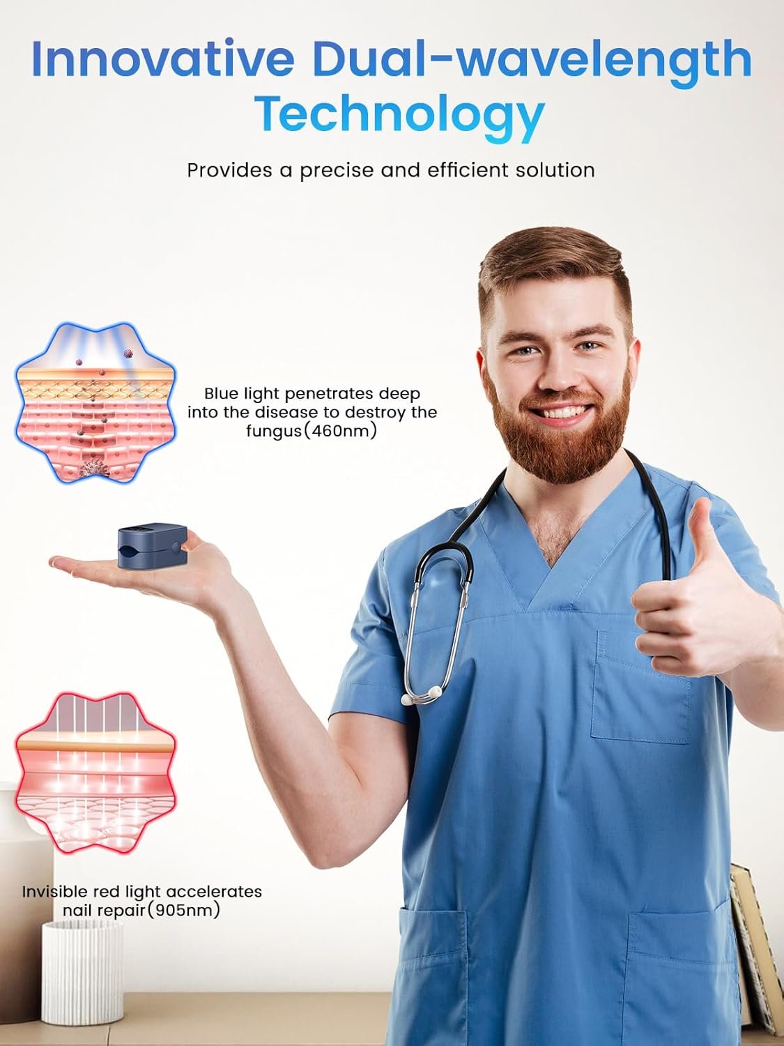 Dual Light Technology: This device combines 460nm blue light and 905nm infrared light to promote healthier nails. Its dual light technology raises nail temperature safely, enhancing their appearance and overall health