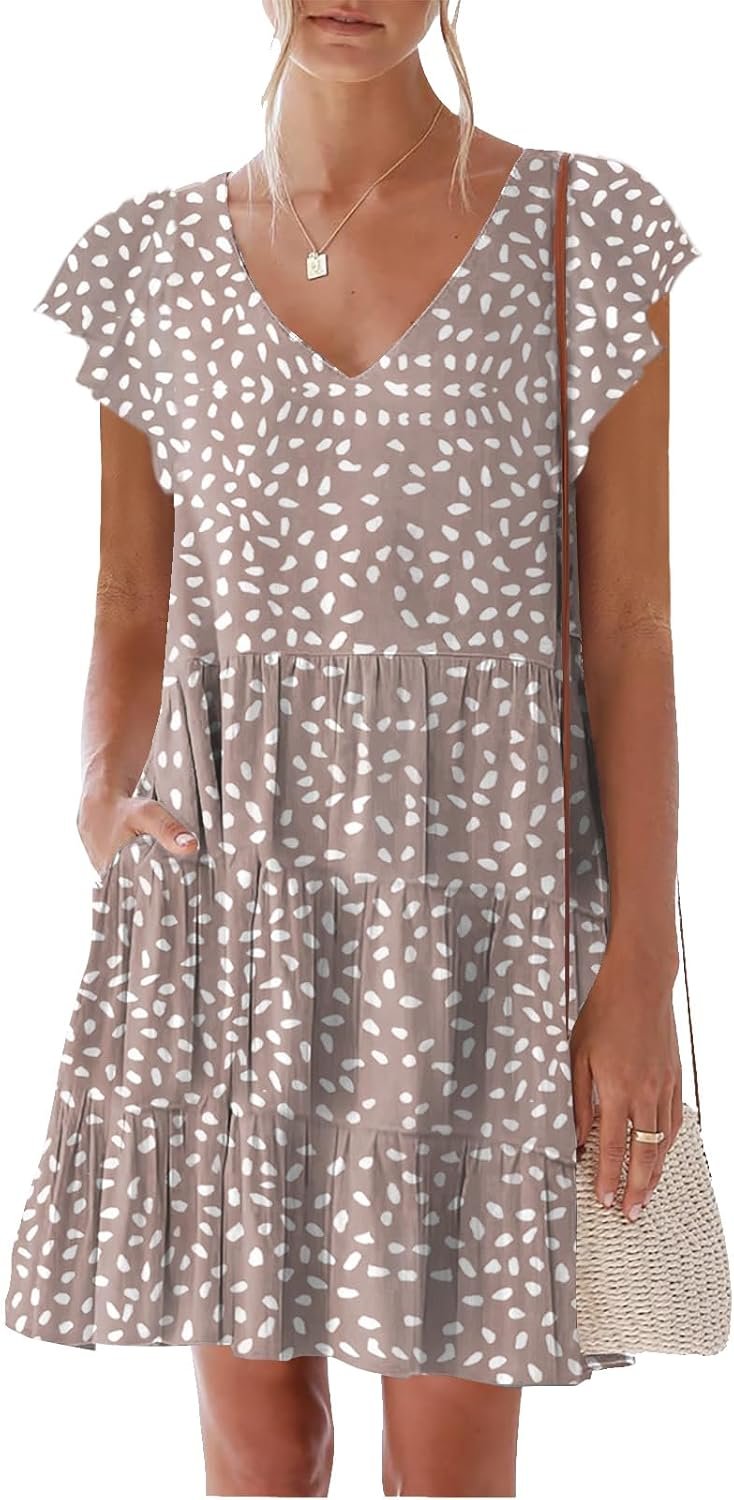 NCLOOK Women’s Ruffle Sleeve Dresses V Neck T-Shirt Dress Vacation Beach Dress