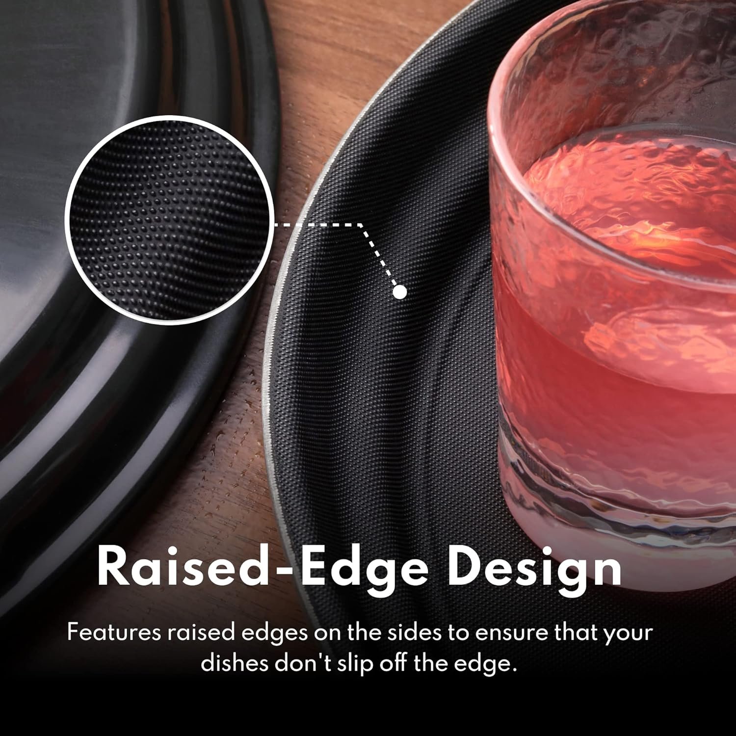 NON-SKID LINER – Features a rubbery, absorbant, non-skid finish on its surface for secure transport of dishes or glassware from kitchen to table, either in your restaurant or your home.