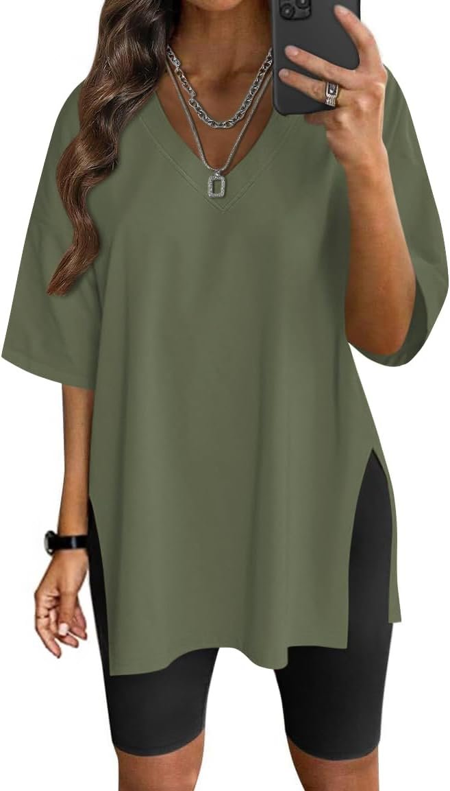 oversized workout t shirts for womens casual plus size deep v neck tops half sleeve side slit teeoversized workout t shirts for womens casual plus size deep v neck tops half sleeve side slit tee