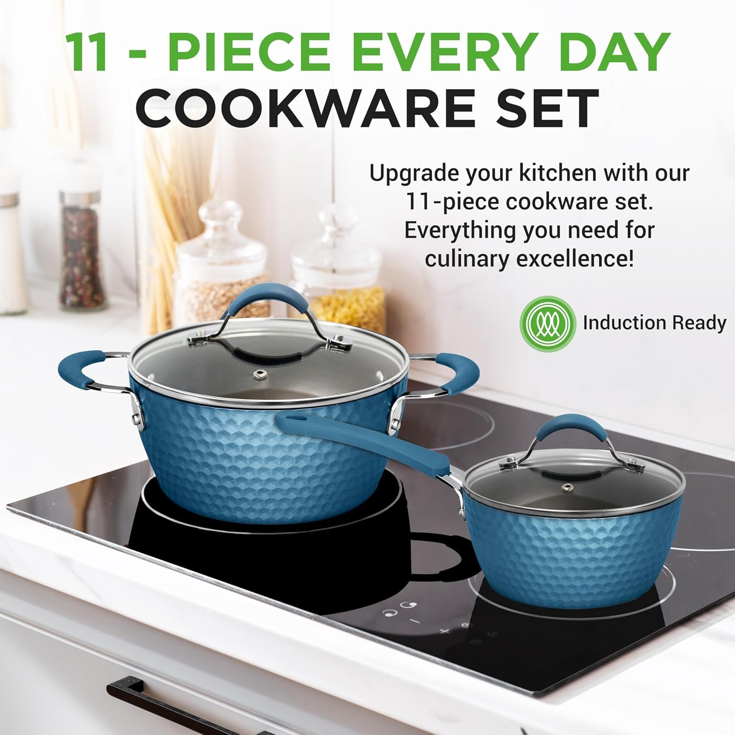 NutriChef 11 Pc Pots and Pans Set Non Stick Cookware with Ceramic Coating, Ergonomic Handles, Induction Ready, Includes Saucepan, Dutch Oven, Large & Small Fry Pans, Royal Blue