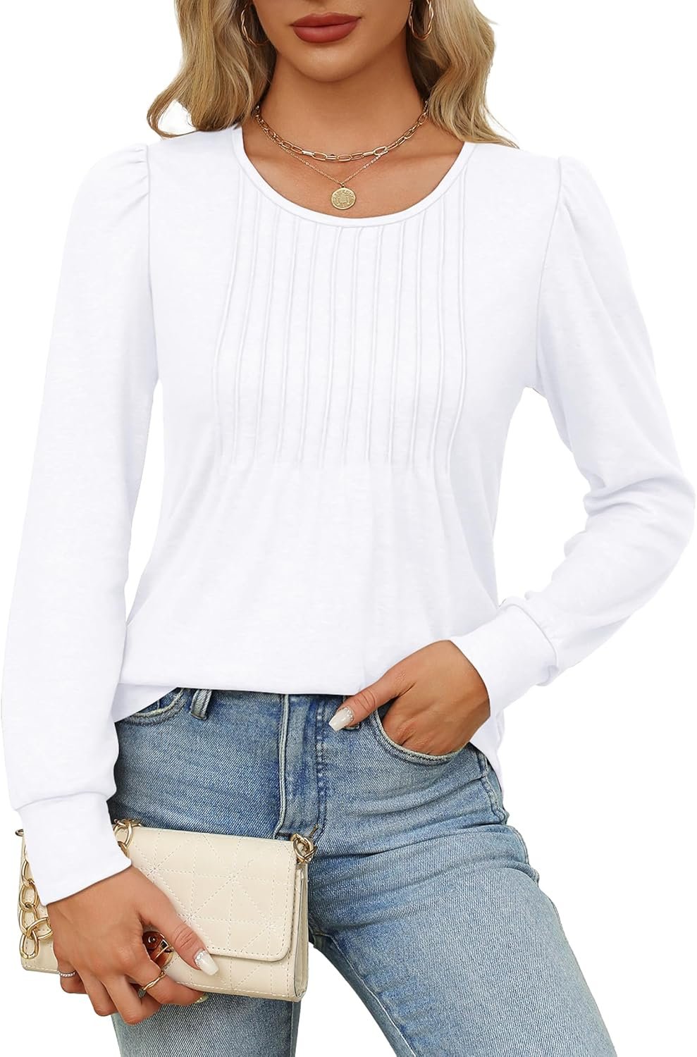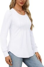 OFEEFAN Long Sleeve Shirts for Women Fall Tops Dressy Casual Blouses Pleated Scooped Neck Tunic Tops for Leggings