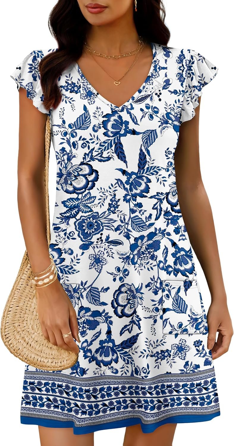 OFEEFAN Womens Summer Dresses 2025 Ruffle Sleeve V Neck Loose Swing Sundresses with Pockets Plain/Print