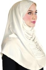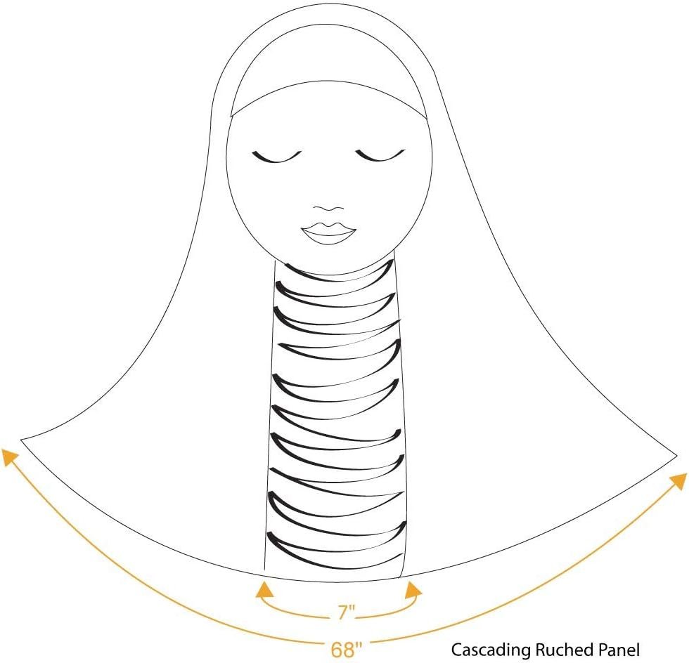 Comfort and elegant drape… what more could you ask for in a hijab? The one piece Ruched Cascade Amira hijab beautifully falls over the shoulders and has a 7” panel of cascading ruched drapes down the front. The hijab is made of medium-weight stretchy Lycra and is extra wide because of the 7” ruched panel so it fits regular and plus-sized women well. The hijabs are machine washable on a delicate cycle and lay flat to dry. Use a warm iron to press. Excessive heat is not recommended because it can damage the Lycra fabric.