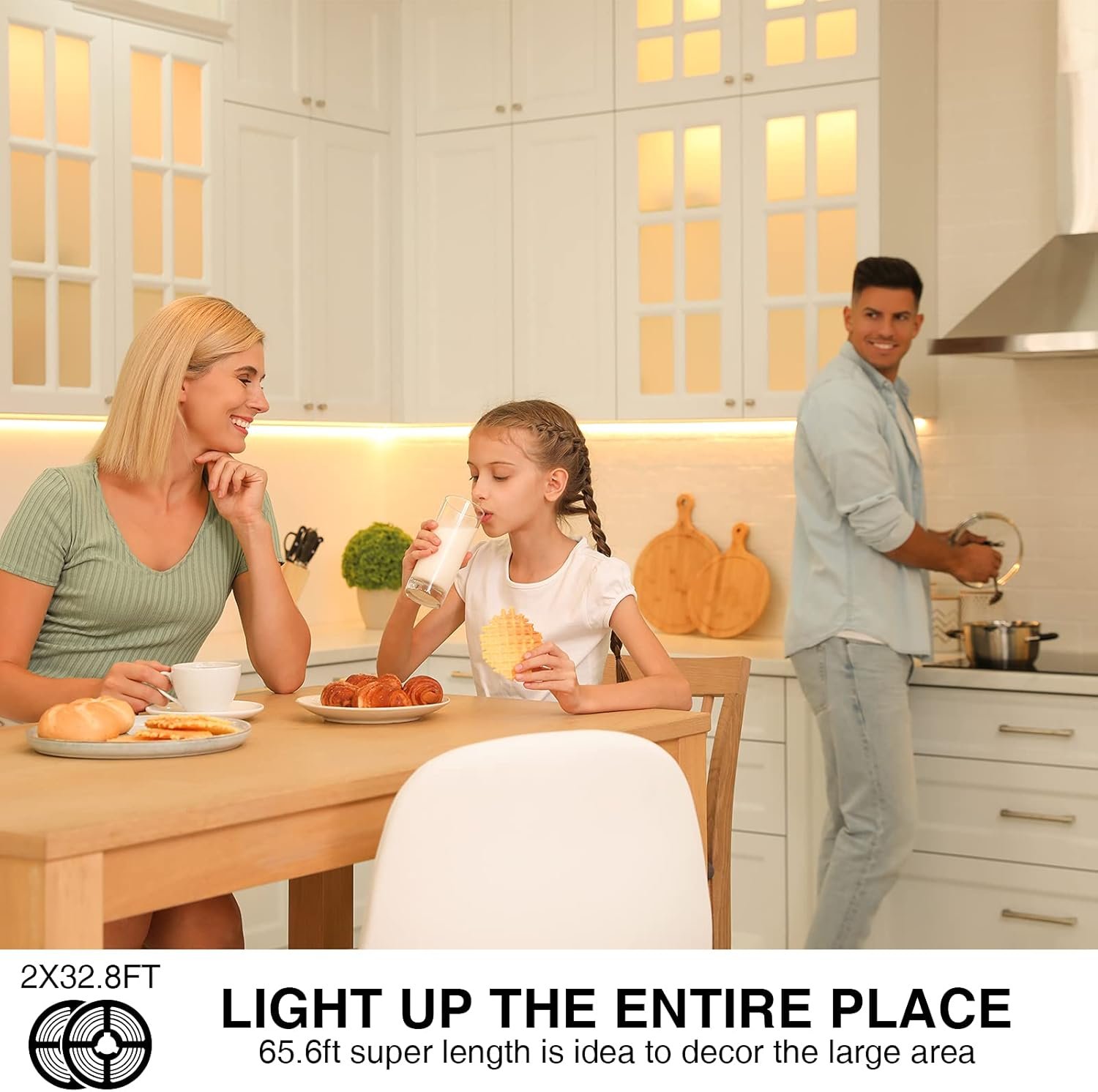 65.6 ft Super Long Design: Comes with 2 rolls 32.8 ft light strips, consists of 1200 pieces ultra-bright 2835 LEDs, 4800 Lm. These dense LED beads can provide more uniform light. 20 m soft white light strip is long enough to light up the whole living room, kitchen, mirror, under the counter, wardrobe, stairs, office, commercial, etc. You can use it for Halloween, Christmas, Valentine’s Day Party