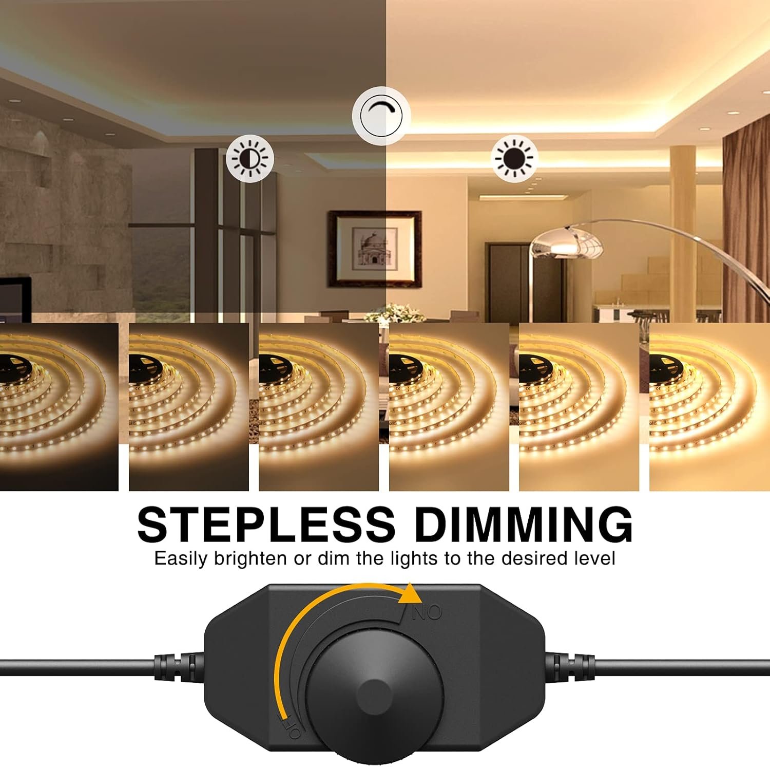Bright Warm White & Dimmable: This 3000 K cozy warm white strip light can be simply controlled by a switch dimmer(included), convenient for adjusting the brightness level as you like. A high color rendering feature will ensure clearly present their natural and vivid color