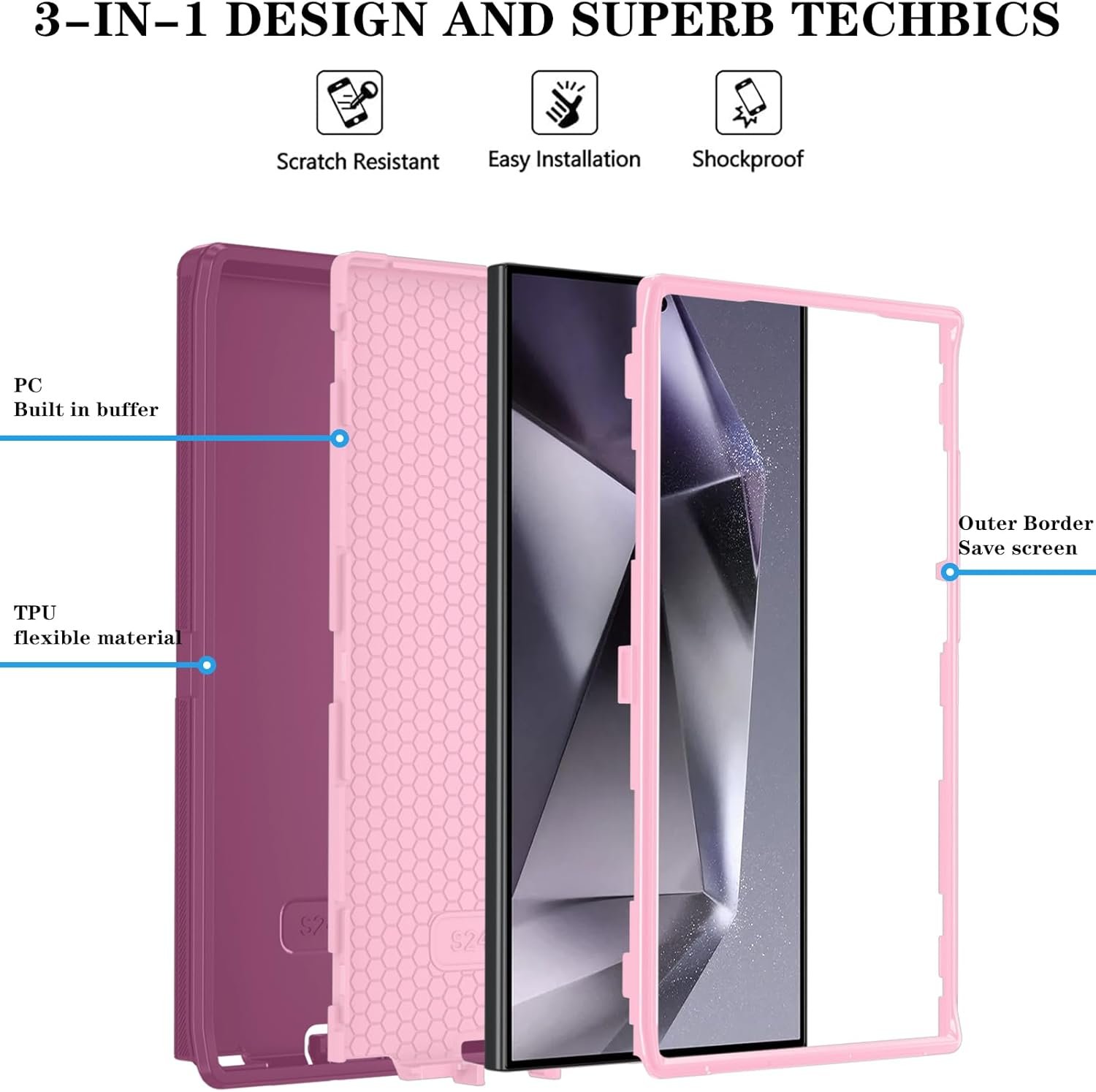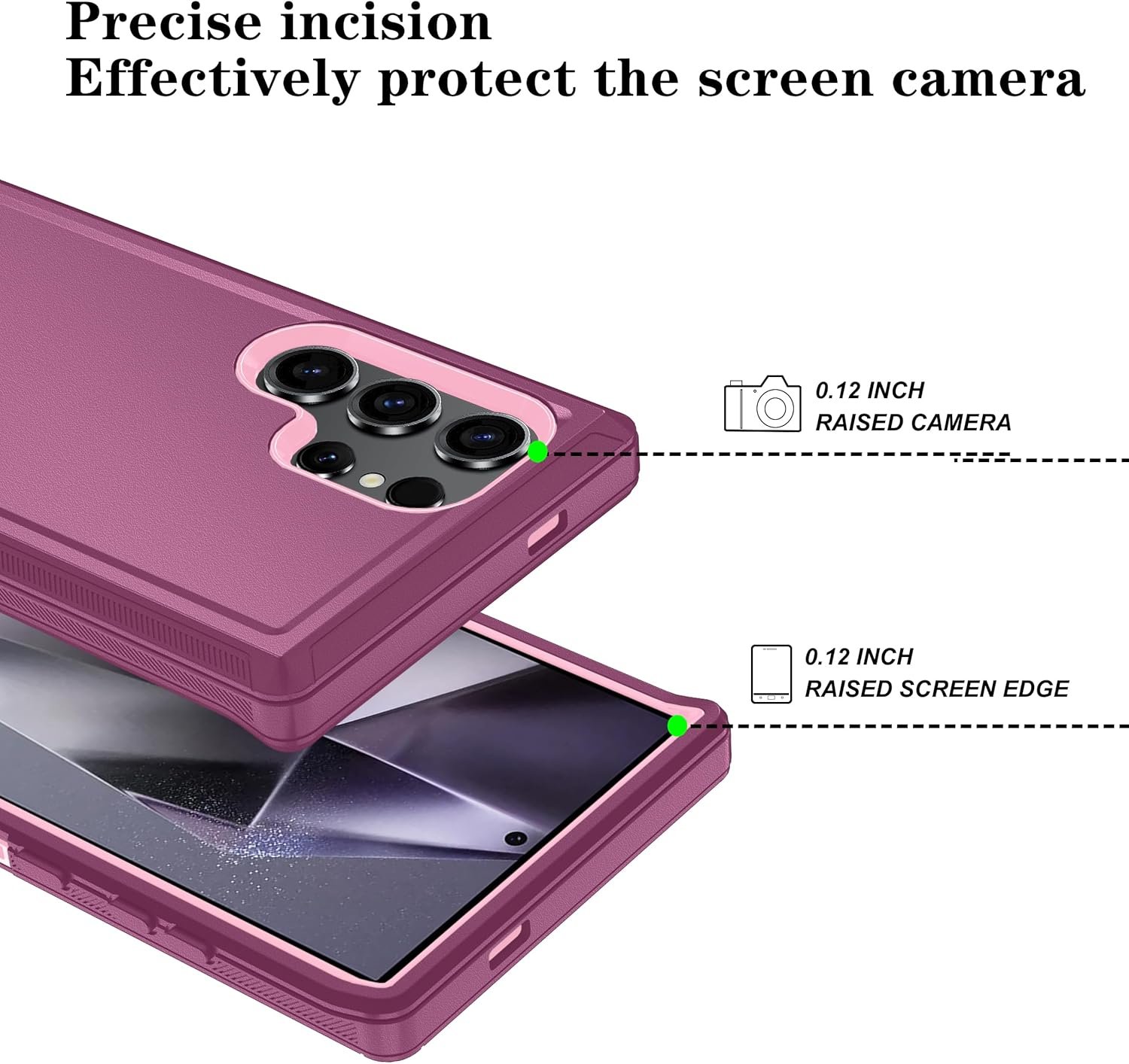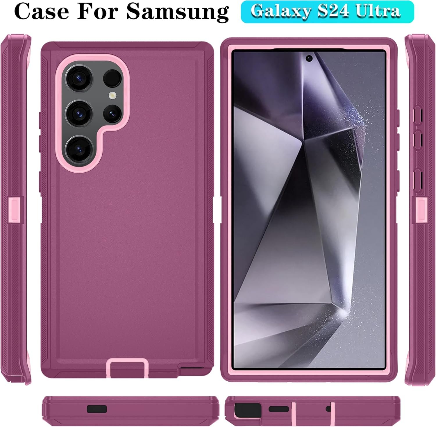 ONOLA Compatible with Samsung Galaxy S24 Ultra Case with HD Screen Protector, Heavy Duty Shockproof & Dropproof 3-Layer Cover Phone Case for Galaxy S24 Ultra 6.8”,WineRed Pink