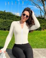 OQQ Womens 2 Piece Long Sleeve Tops Stand Neck Front Zipped Stretch Fitted Underscrubs Tee Shirts Tops