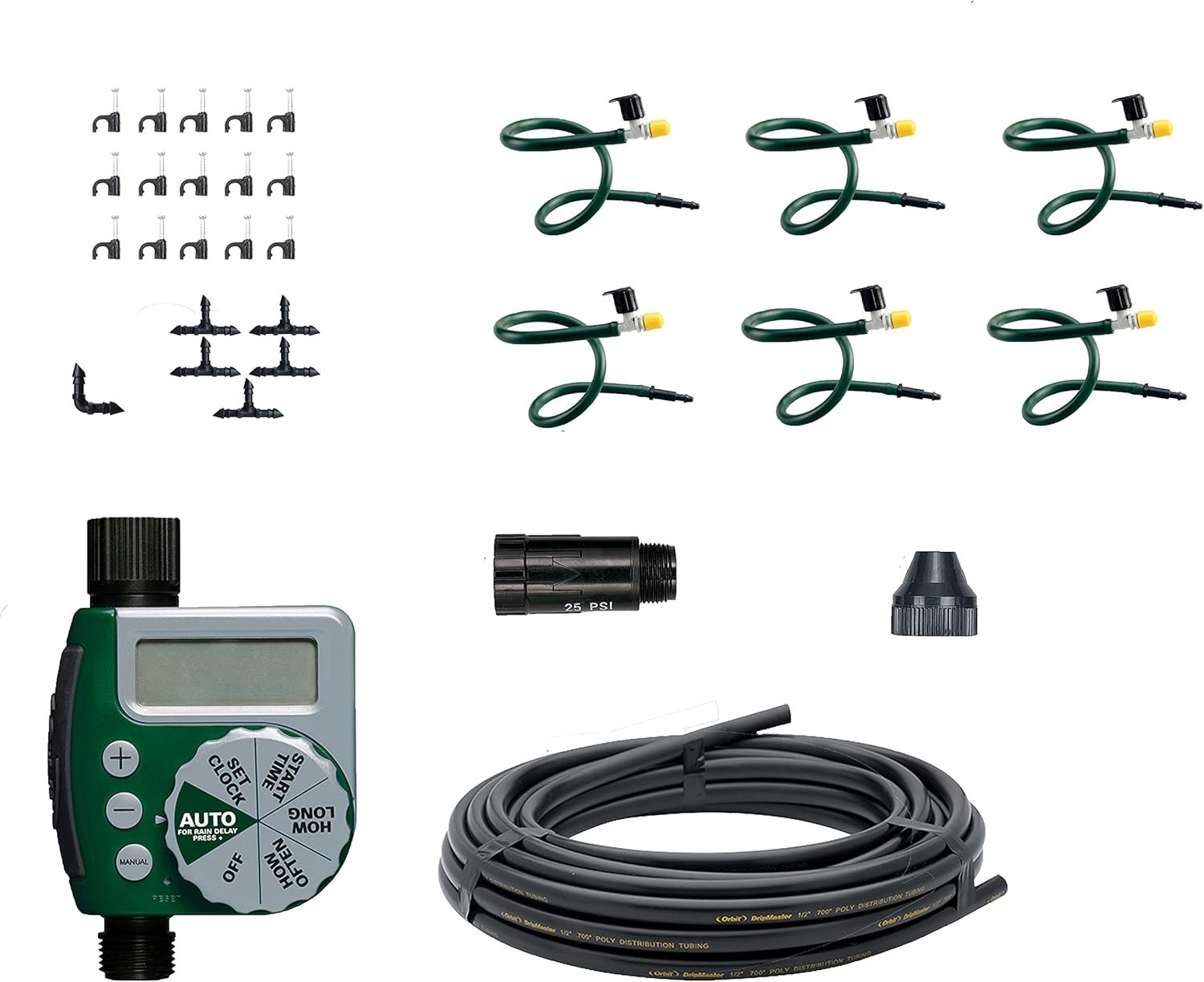 The hanging basket drip watering kit is engineered specifically for watering one large hanging basket or two smaller hanging baskets. The misting micro-sprinklers with flow control provide optimum flow so that the potting soil can easily absorb the watering without puddling. You can easily store it during the winter. The Hanging Basket Drip Watering Kit includes: 1/4″ Drip Blank Distribution Tubing (30 feet), 1/4″ Barb Flex-Mist Misting Drip Micro-Sprinkler with Flow Control (2), 1/4″ Barb Drip Tee, 1/4″ Drip Tubing Anchor Strap, 3/4″ FHT x 1/4″ Drip Tubing Adapter for connecting 1/4″ Drip Tubing directly to your hose faucet or timer, a filter screen washer, and a 3/4″ FHT 25 PSI pressure reducer to protect your drip system. The 56318 Hanging Basket Drip Watering Kit includes a 1-Outlet Digital Hose Faucet Timer. The digital timer offers oversized features for ease of use, a manual rain delay option which conserves water, and programmable runtime and interval scheduling flexibility, with heavy-duty, weatherproof construction. Attach the digital timer to your outside faucet and enjoy a fully automatic drip watering system. Compatible with drip fittings from Orbit, Hydro-Rain, and other major brands, which makes the kit easily expandable. For outdoor irrigation use with cold water only.