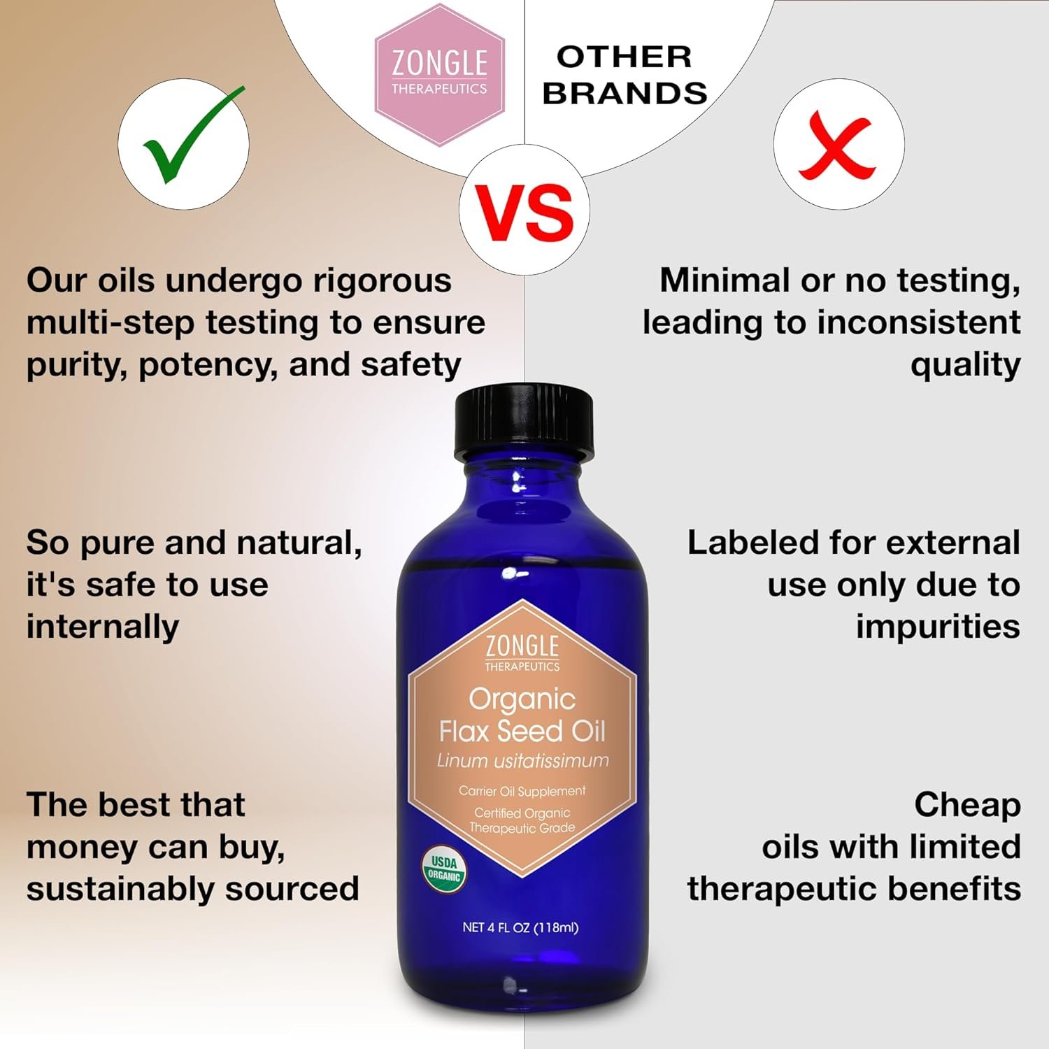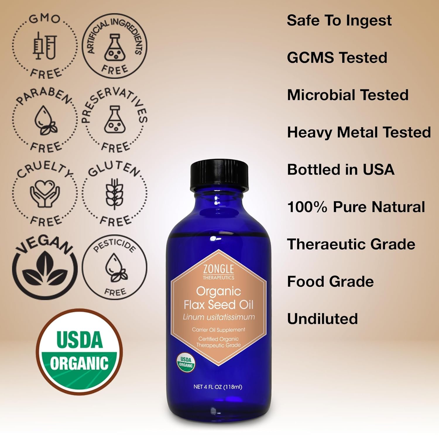 Zongle USDA Certified Organic Flax Seed Oil, Safe to Ingest, Unrefined Virgin, Cold Pressed, Linum Usitatissimum, 4 oz