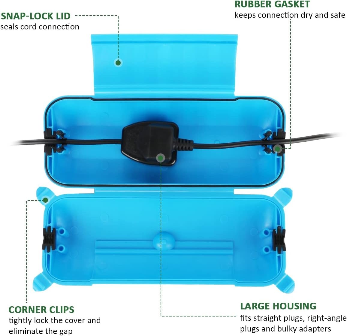 With the 4 corner clips, snap-lock lid, and self-adjustable rubber gaskets, this outdoor power box is IP44 waterproof. Perfect to seal 12, 14, 16, 18 gauge cord, braided wire and flat cable.
