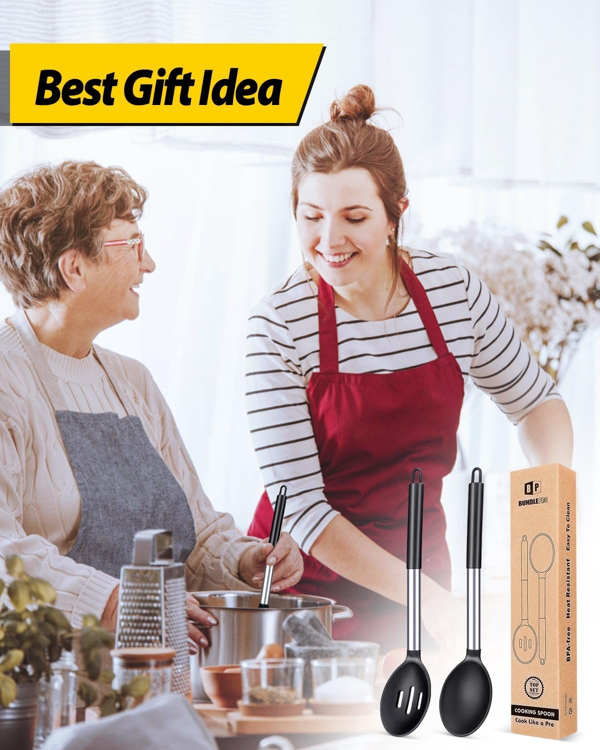 Pack of 2 Large Silicone Cooking Spoons,Non Stick Solid Basting Spoon,Heat-Resistant Kitchen Utensils for Mixing,Serving,Draining,Stirring (BLACK)