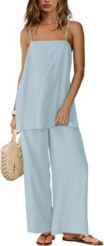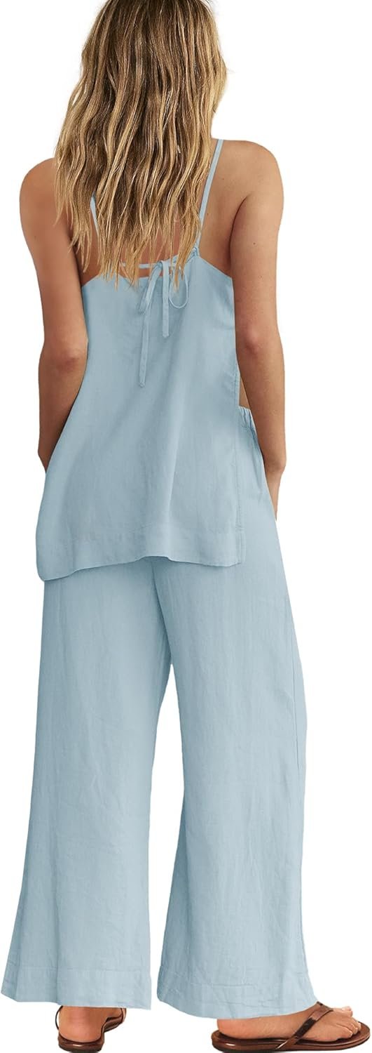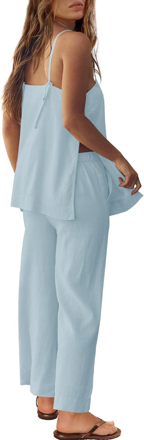 Panadila 2 Piece Linen Set Summer Travel Beach Vacation Outfit Sexy Spaghetti Strap Tank Top and Pants with Pockets