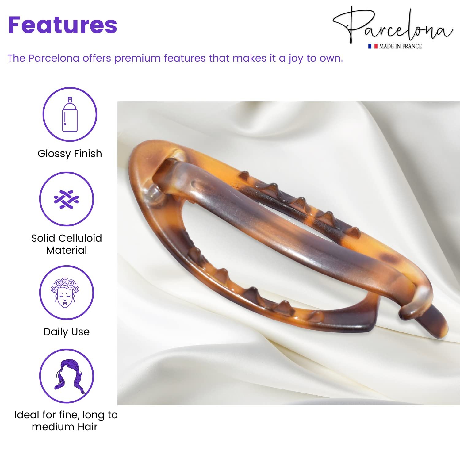The Parcelona Hair Collection provides a variety of women hair accessories made in Europe. All the products are made from cellulose acetate, perfectly polished for a splendid finish, distinctive patterns, and designs. This collection brings you a vast array of hair accessories ranging from hair claws, barrettes, combs, clips and more. The products feature classic, and imperishable designs which complement any hair type from short to long, fine to thick, and straight to curly: a versatile collection rare in retail stores. The Parcelona hair accessories are elegant and exquisite, and perfectly assorted to give your hairstyle an aesthetic look.