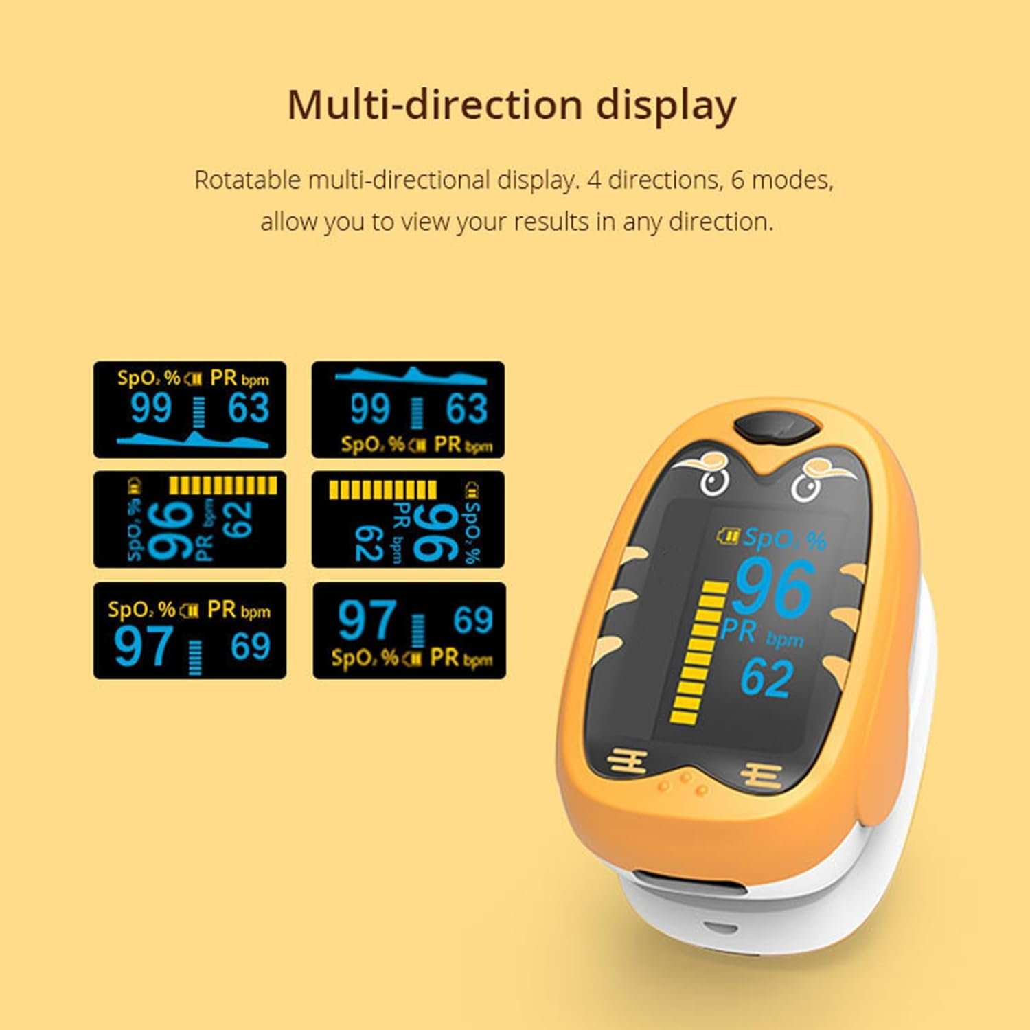 Rotatable display:pulse oximeter fingertip Rotatable multi-directional display, 4 directions, 6 modes, any position can clearly read the blood level and pulse measurement value, oxygen meter One button can easily switch, pulse ox Bringing you a comprehensive and convenient monitoring experience!