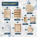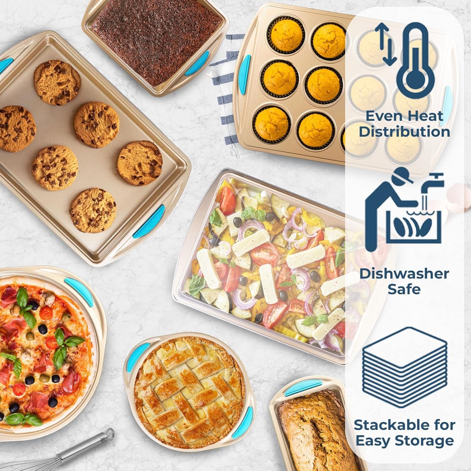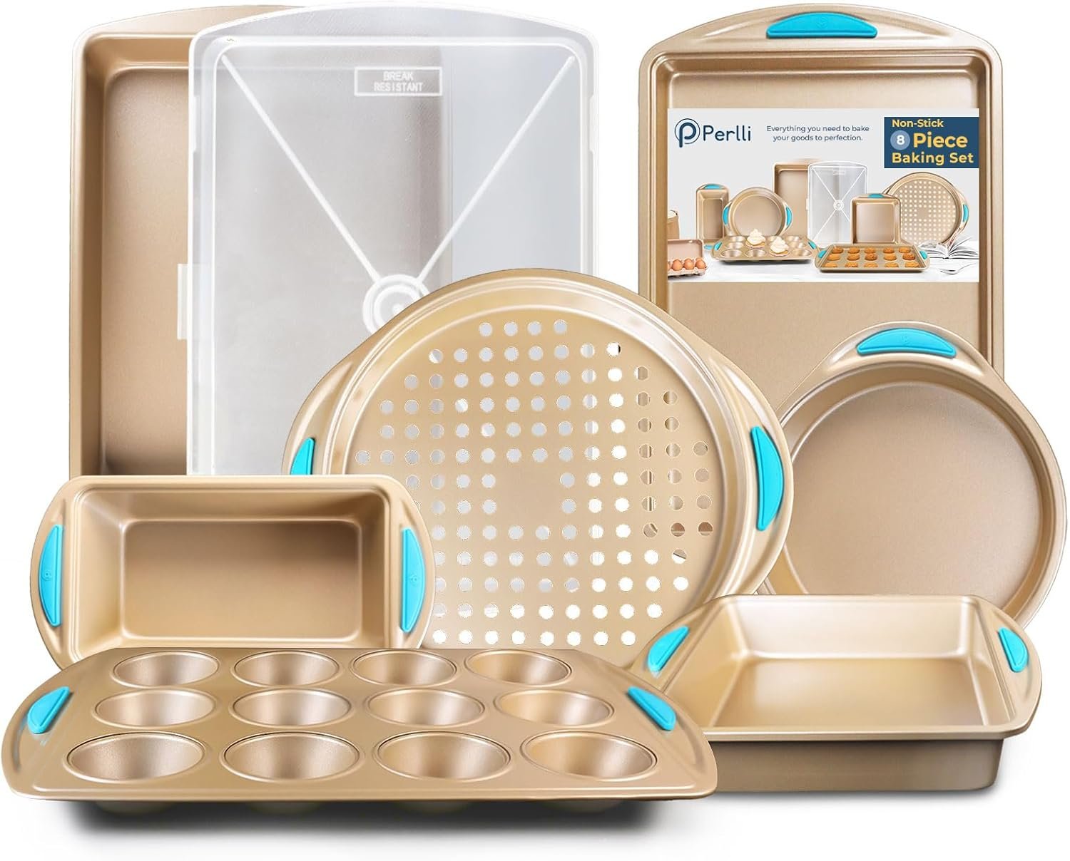Perlli Baking Pan 8 Piece Set Nonstick Gold Carbon Steel Oven Bakeware Kitchen Set with Silicone Handles, Cookie Sheet, Roasting Pan, Lid, Square Pan, Pie Pan, Loaf Pan, Pizza Crisper, Muffin Pan
