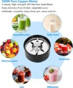 High Quality: 350W pure copper motor electric blender with power cord, overheating automatic power-off protection, ABS plastics suitable for food process, makes the mixer safer to use. 4-leaf stainless steel hard cross blade can make protein shakes,peanut butter,smoothies, vagetable & fruit juices ,milkshakes, jam, baby food easily.