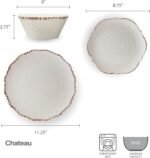 Bring a touch of sophistication to your everyday table setting with thisPfaltzgraff Chateau White 12-Piece Dinnerware Set. Made of high-quality,melamine, this durable dinnerware features an embossed scroll design and scalloped edges with a color accent. The elegant and stylish design elevates any meal. 12-piece set, service for 4, includes 4 each of: 11-1/4 inch dinner plate, 8-3/4 inch salad plate, and 6-inch bowl with a 23-fluid ounce capacity. Dishwasher safe.