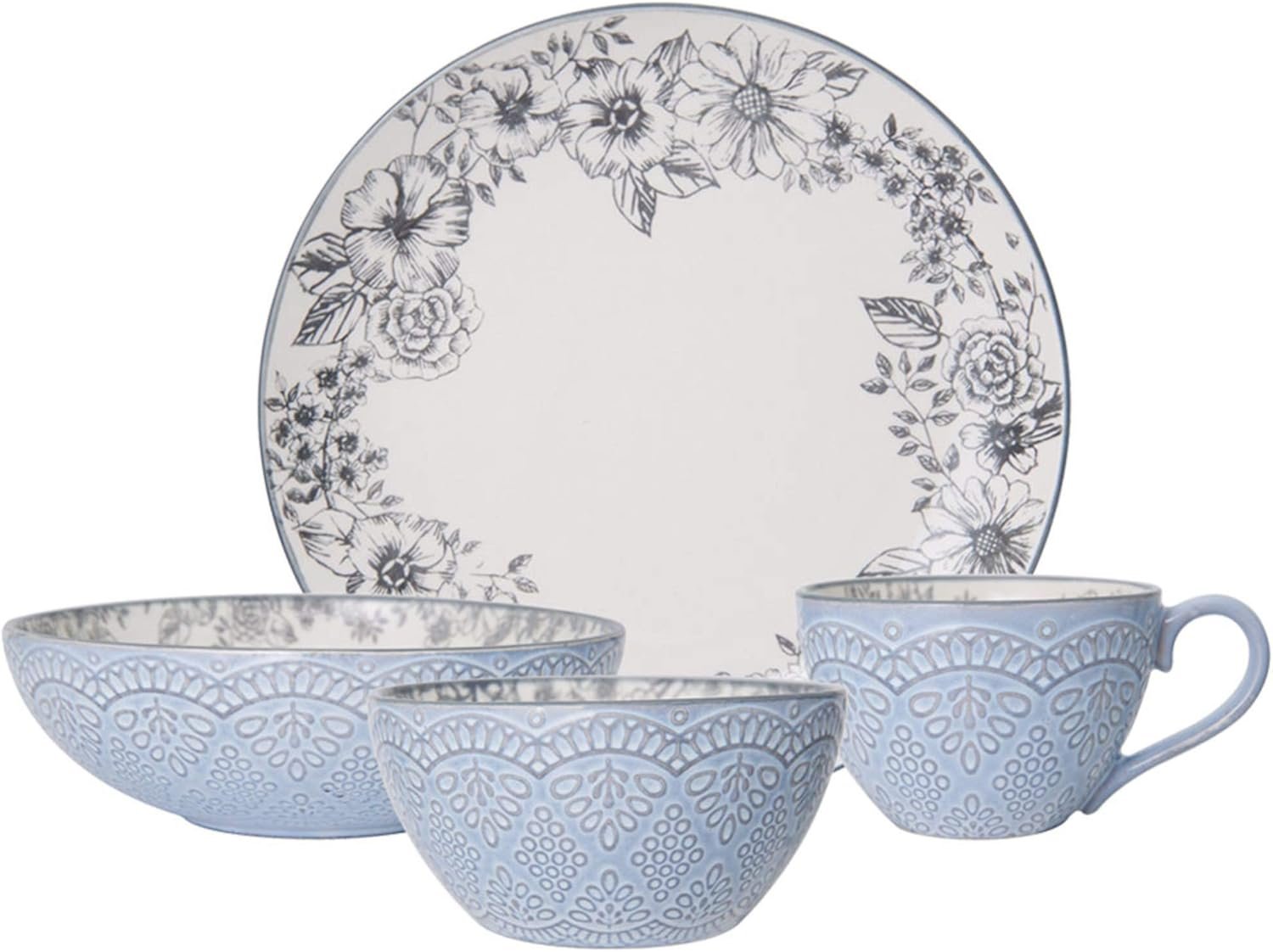This Pfaltzgraff Gabriela Grey 16-Piece dinnerware set features a sketched gray floral design with a gray reactive glaze on the outside of each piece. Due to the nature and hand-crafted qualities of the reactive glaze, no two pieces are exactly alike and will exhibit unique variations in color and pattern. The set is crafted from high quality stoneware for lasting beauty. This 16-Piece set features service for four and includes 4 of each: a 10-1/2 inch dinner plate, an 8-inch salad plate, a 6-inch bowl, and a 12-ounce mug. The beautifully detailed design compliments any decor and is perfect for everyday use. Dishwasher and microwave safe.