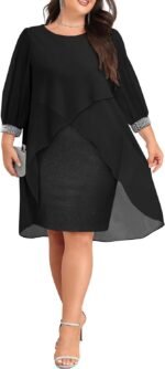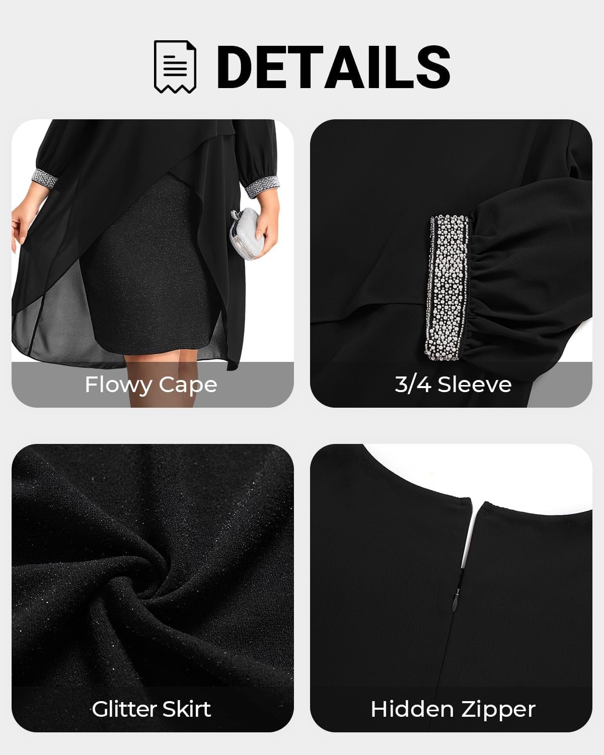 BUYERS SHOW plus size chiffon cape dress plus size black dress plus size semi formal dress elegant cape knee length glitter dress plus size cocktail dress curvy church