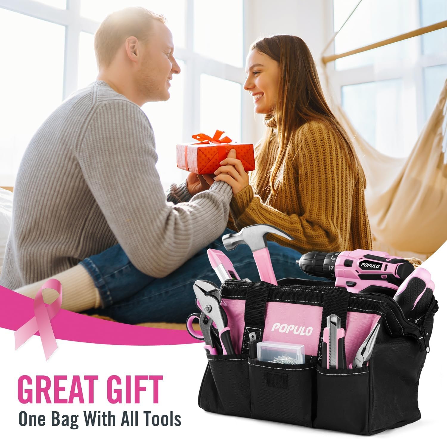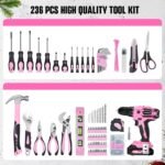 populo Pink Tool Kit 236-Piece with Cordless 20V 2000mAh Power Drill Driver, Lady’s Basic Home Tool Set with 12-Inch Pink Tool Bag, Electric Drill Sets Combo Kit for Women, House, DIY