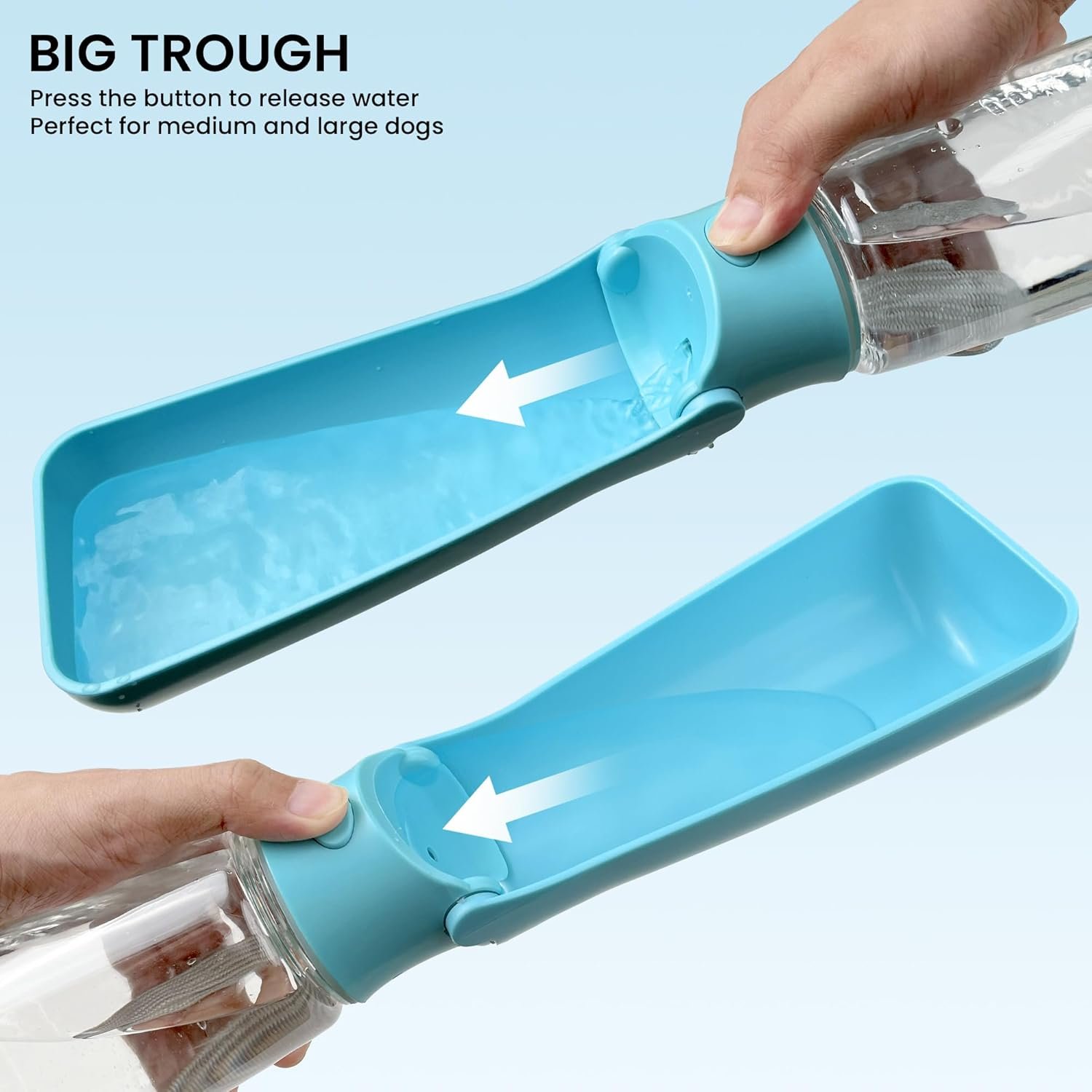LARGE CAPACITY: Dog travel water bottle has a 19 oz capacity and a large 3.4 inch sink, suitable for puppies, small, medium, large dogs. It will provide clean water for your pet even in travel, keep your pet well hydrated outdoors