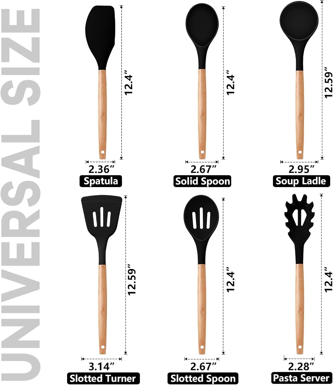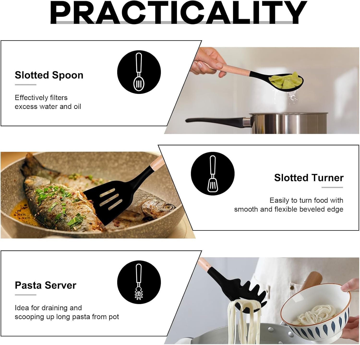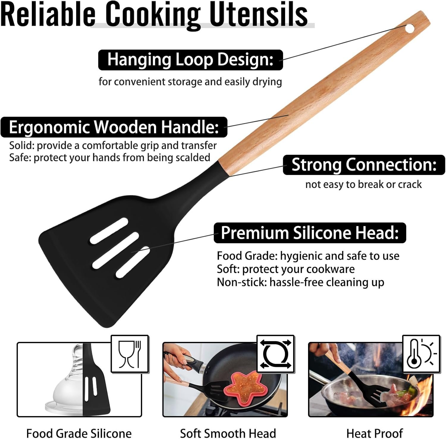 【Healthy & Heat Proof】P&P CHEF cooking utensils set is crafted from food-grade silicone and premium wooden, both of them will not react with food or beverages, No need to worry about chemicals leaching into your food, Silicone head could withstand high temperatures up to 446°F/230°C, Ability to cook hot food and will not react with them at high temperatures