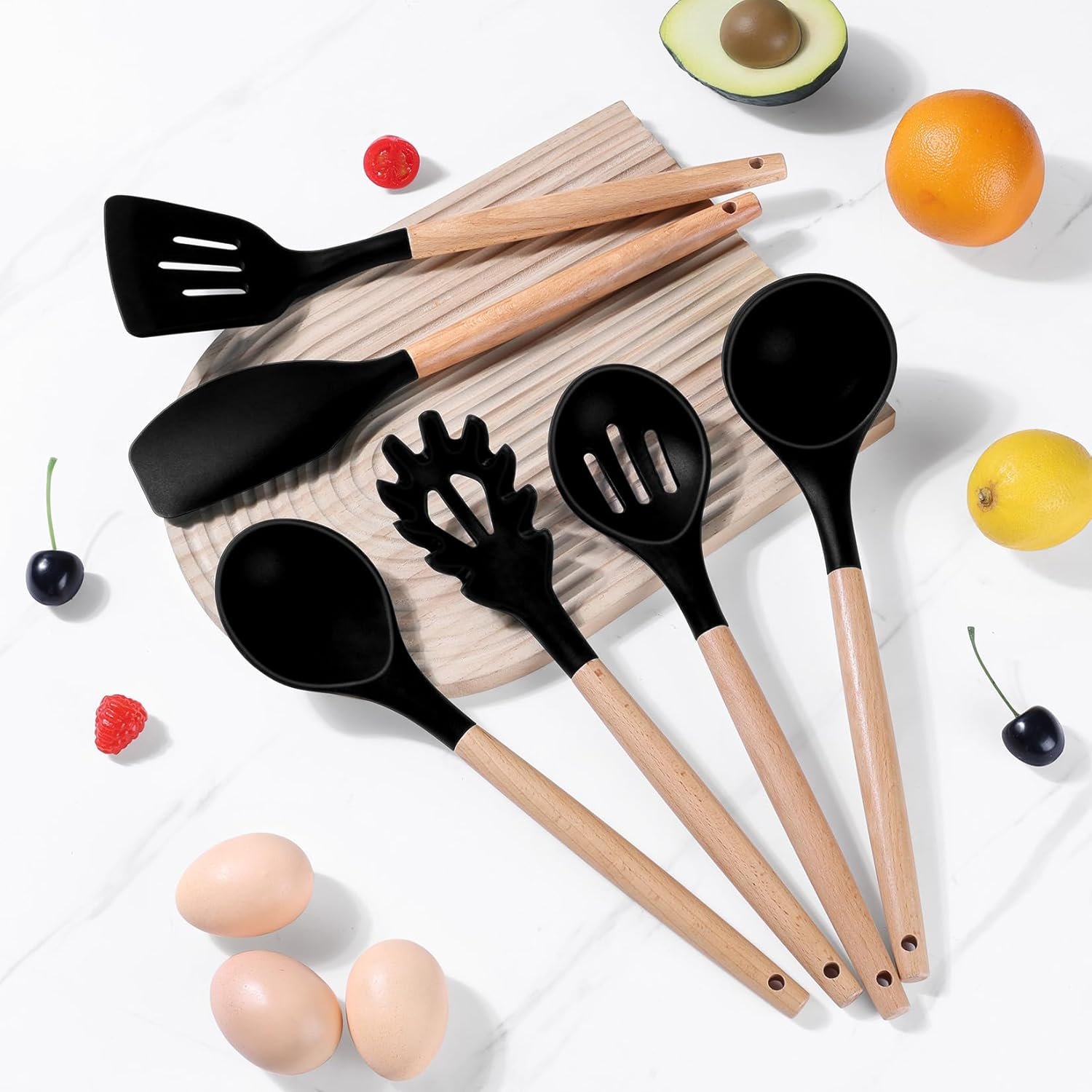 P&P CHEF Cooking Utensils Set, 6 PCS Kitchen Utensils with Wooden Handle, Silicone Spatula for Nonstick Cookware, Easy Clean & Non-toxic, Black