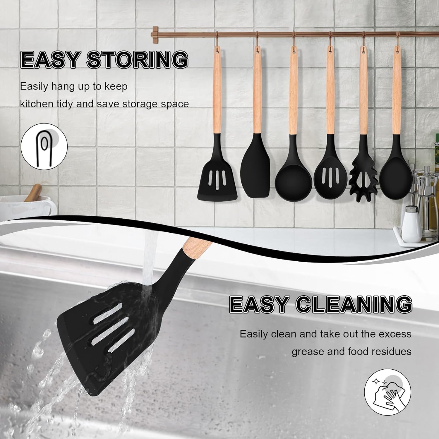 【Easily Clean & Store】The non-stick silicone ensures food slides effortlessly off the kitchen utensil, Reducing the need of excessive oil and making cleanup a breeze, Simply wipe them with soap and water, Each utensil was designed with a hanging hole on the handle, Helping to keep your kitchen organized and adding a decorative effect