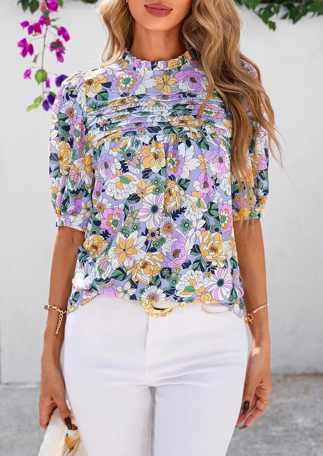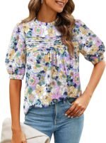 PRETTYGARDEN Floral Tops for Women Blouses Dressy Casual 2025 Summer Trendy Outfits Boho Pleated Short Sleeve Shirts