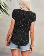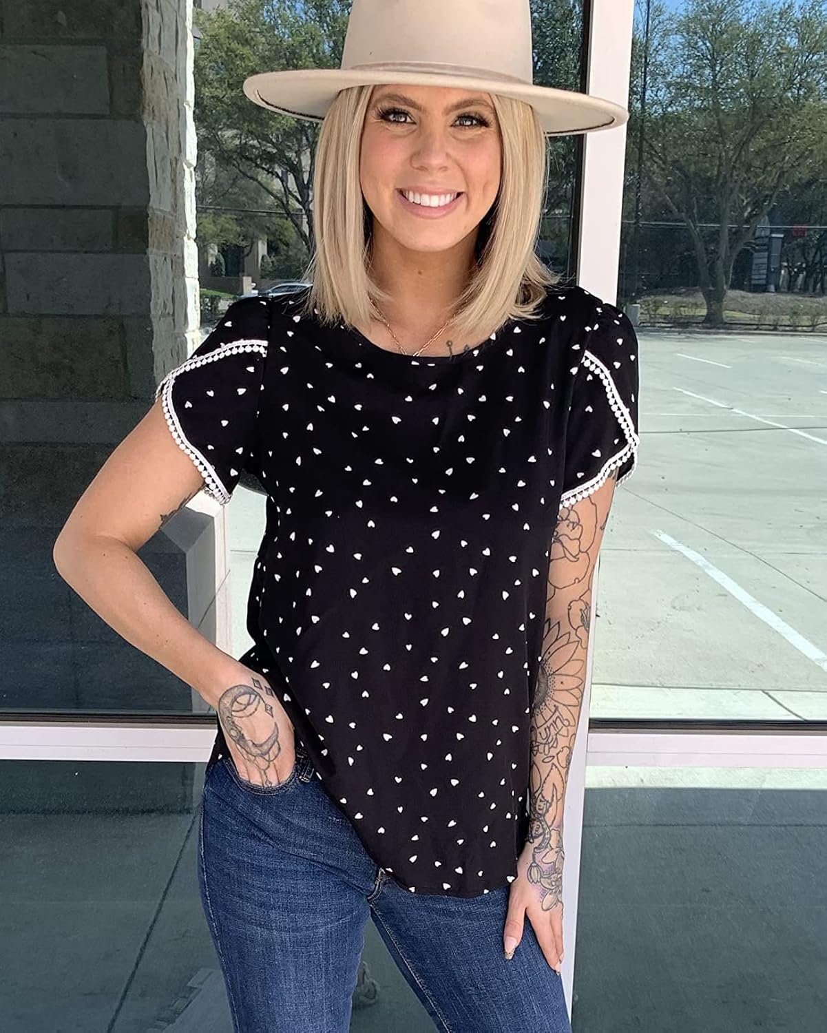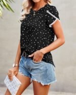 Features—round neck shirts for women / petal sleeve tops/ short sleeve blouses / lace crochet shirt for women / leopard print blouses for women / polyester blouses for women / lightweight shirts for women / going out tops for women / womens workout tops / y2k tops