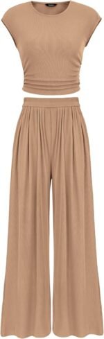 Unique Design:Crewneck Top / Cap Sleeve Blouse / Ruched Cropped Top / Wide Leg Pants / Solid Color 2 Piece Pant Outfits / Elastic High Waist Pant / Lounge Sets For Women