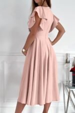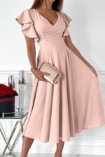 Women Summer Midi Dress With Zipper At The Back, More Easy To Take On And OffSexy V Neck Swing Dress Shows Off Your Pretty Neckline, Never Go Out Of FashionLadies A Line Dress Features In Ruffle Cap Sleeve, Adds A Sense Of Elegance