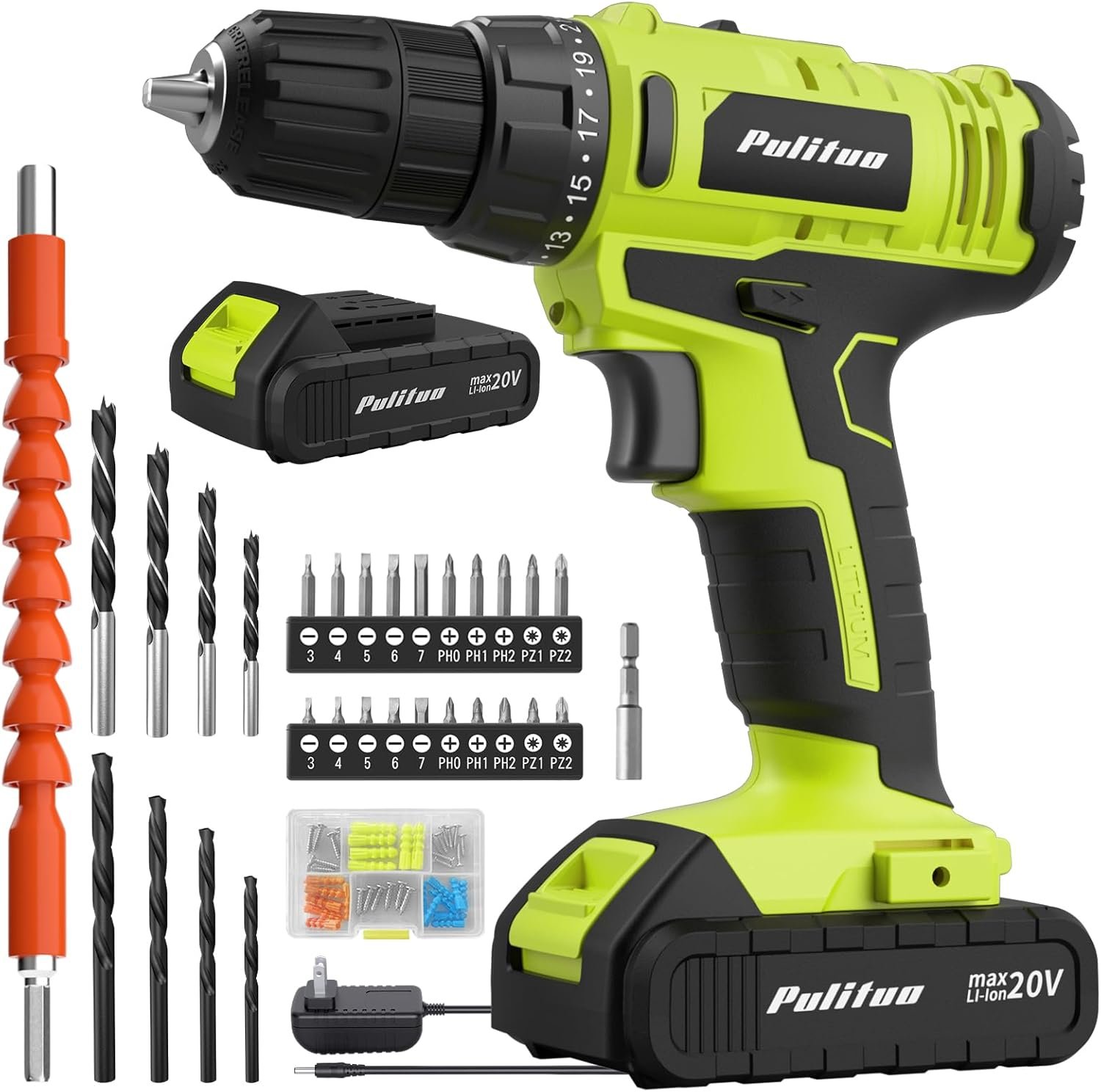 PULITUO 20V Cordless Drill/Driver with Battery and Charger, 3/8″Keyless Chuck, 2 Variable Speed, 266 In-lb(30 N.m), 21+1 Torque Settings, power Drill with LED Light, Drill Driver Kit for Home.(Green)