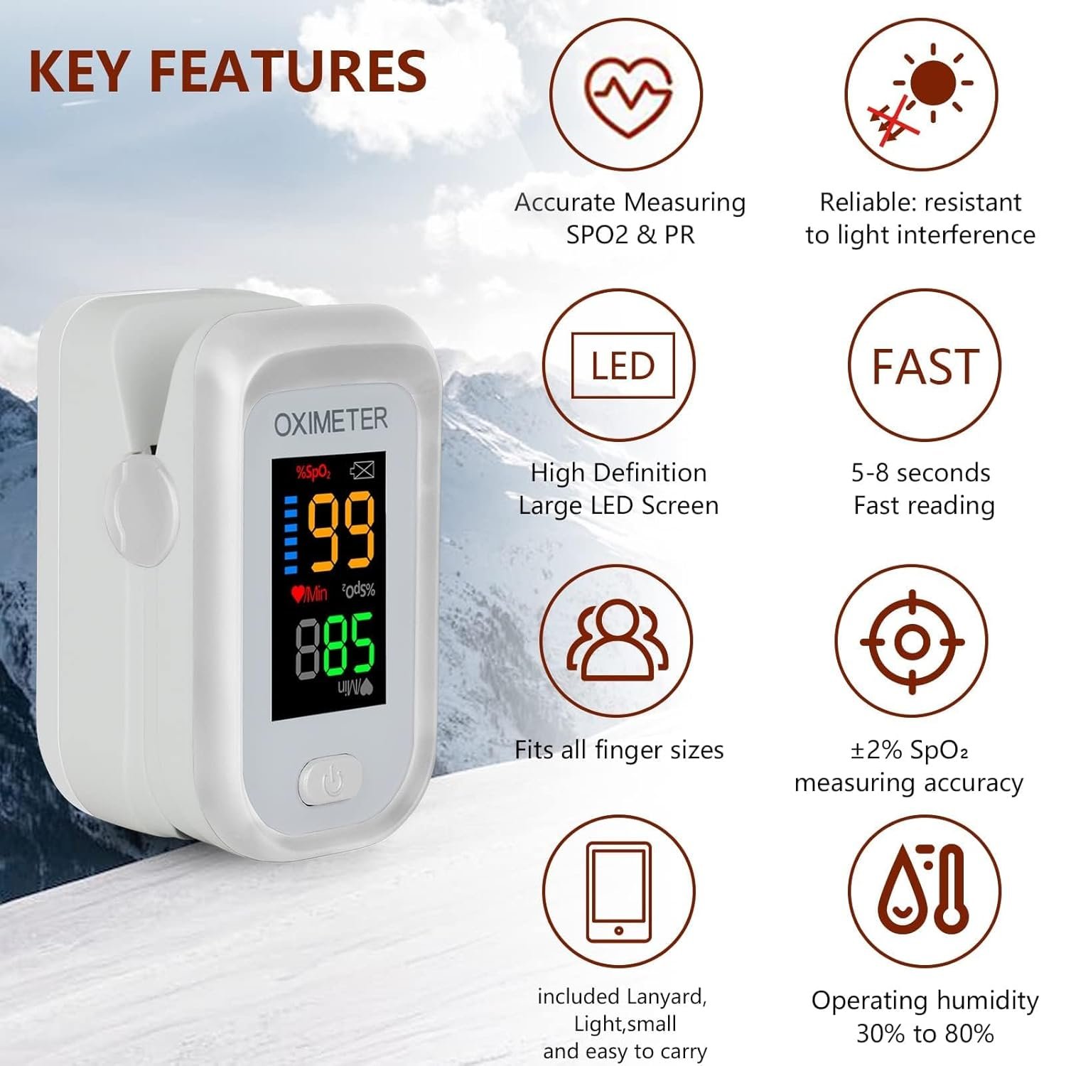 【What You Get】7*24 hours friendly customer service, if the product has quality problems, please contact the seller via Amazon email for a free replacement. This device is for sports or aviation use only, not for medical use. Accessories include Oximeter×1, Portable lanyard×1 (easy to carry), Packaging Box×1, and User manual×1.