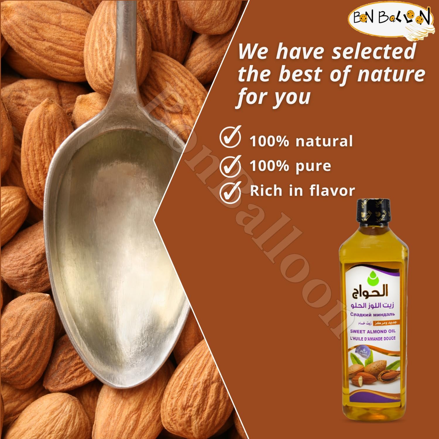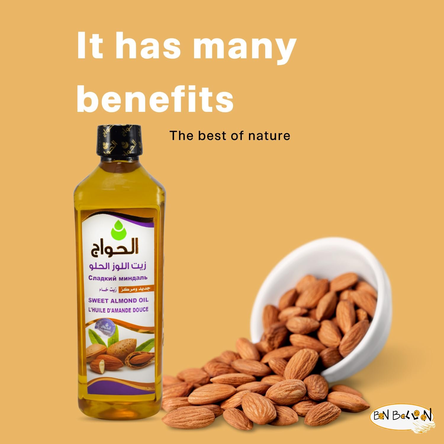 Pure & Natural Virgin Sweet Almond Oil Cold Pressed Pure Al Hawaj Elhawag El Hawag Concentrated Crude Perfect Fresh For Skin & Body (1 Pack = 17.64 oz / 500 ml) زيت اللوز الحلو الحواج