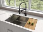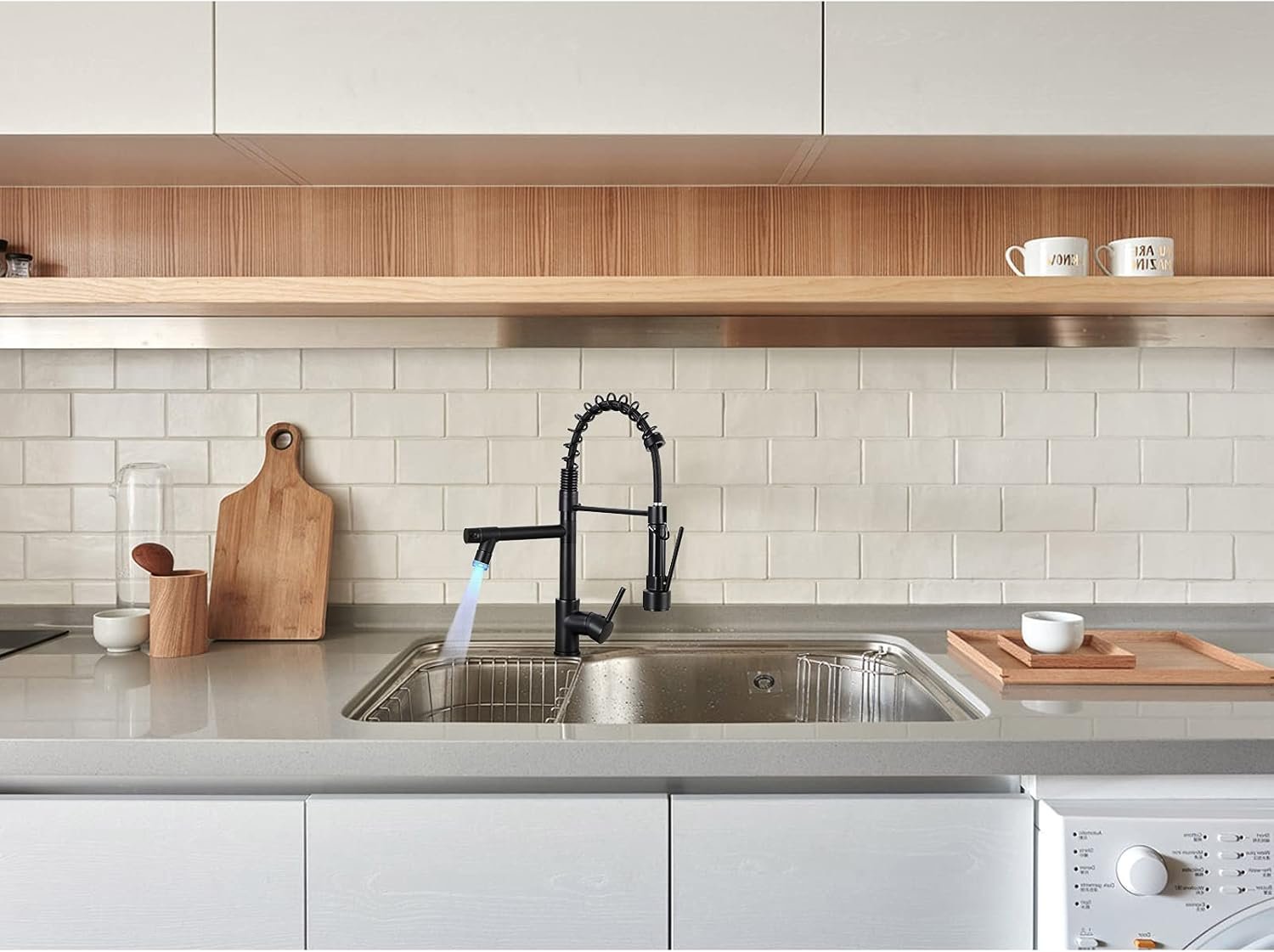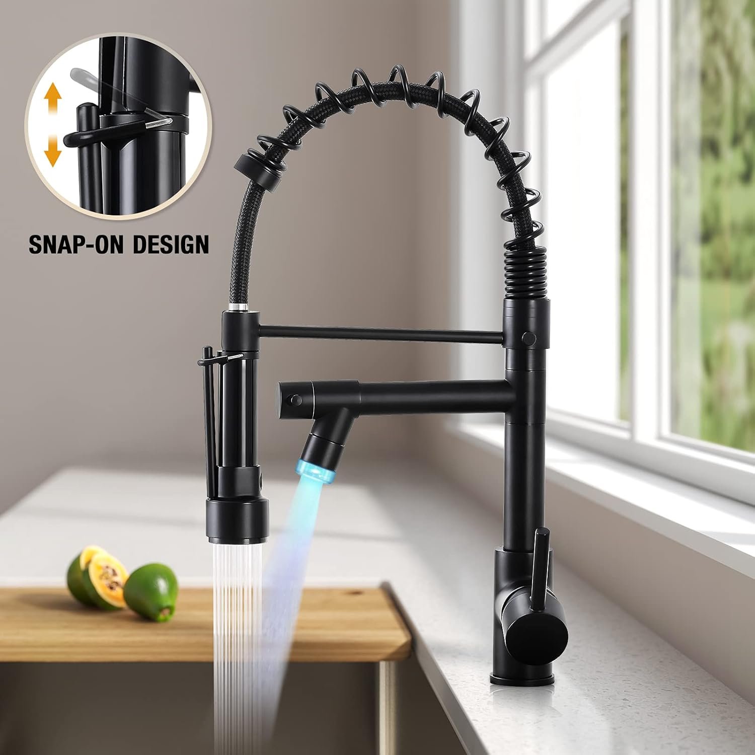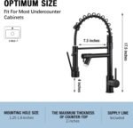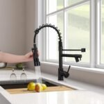 Single Handle Design—This pull-down kitchen faucet with 360 Degree Swivel Sprayer and Spout can turn on at the same time which and the pre-rinse faucet ensures high pressure while still saving on water.Easy to adjust suitable water temperature and flow volume, bring us a joyful experience when using this spring faucet.