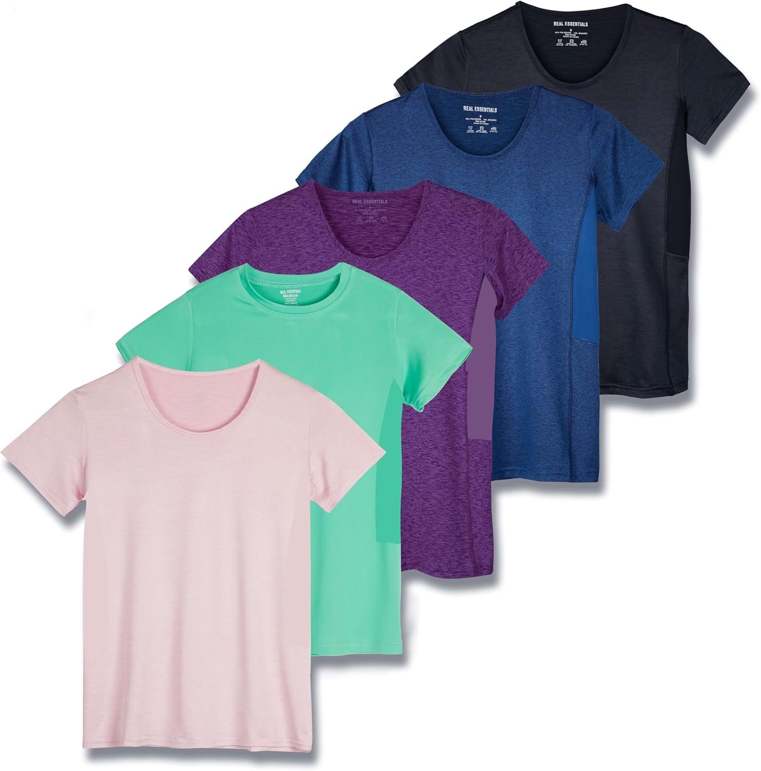 Real Essentials 5 Pack: Women’s Dry Fit Tech Stretch Short-Sleeve Crew Neck Athletic T-Shirt (Available in Plus Size)