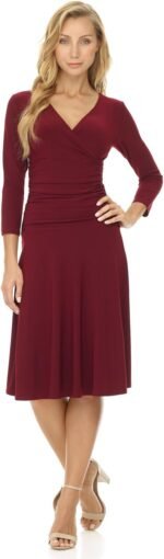 Surplice crossover v-neck elongates your look while still being modest.Wide ruched waist and flared skirt enhance and give an hourglass figure.Knee length, full skirt is classic and chic. 3/4 sleeves cover your arms, no need for a shawl.Model is 5’9″ wearing size 4