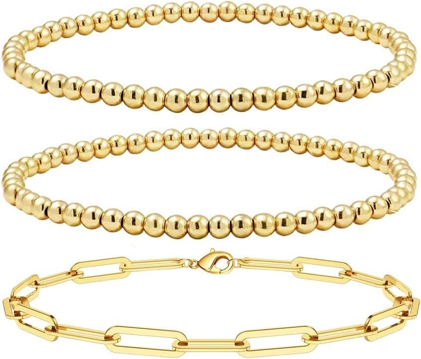 Reoxvo 14k Gold Plated Charm Bangle Cuff Bracelet Set for Women Stack Non Tarnish Gold Beaded Paperclip Chain Link Bracelets Jewelry Gifts for Women Trendy